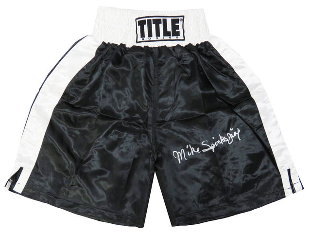 Michael (Mike) Spinks Signed Title Black With White Trim Boxing Trunks w/Jinx