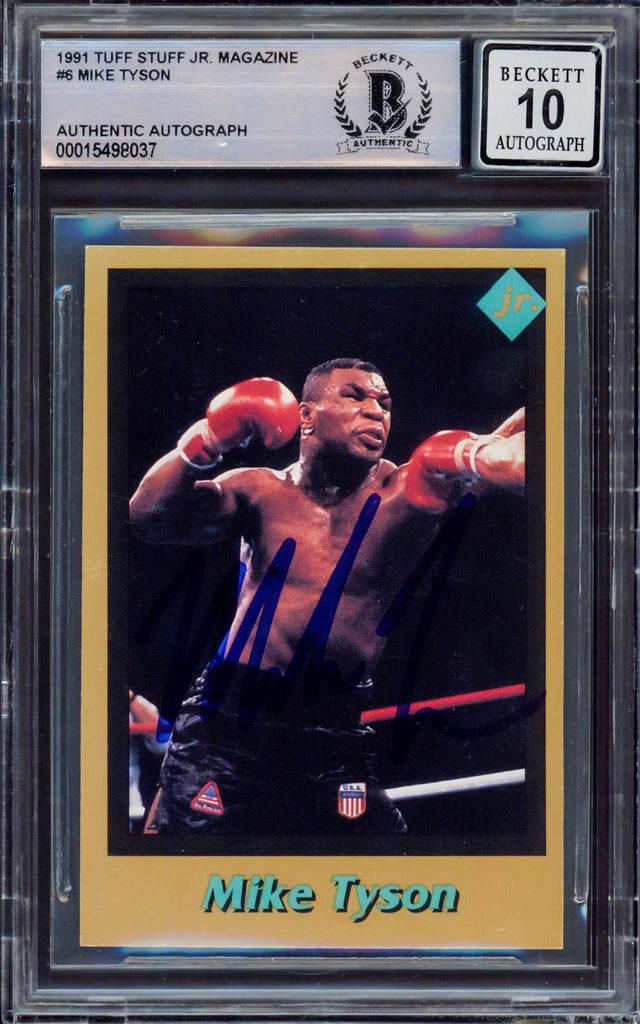 Own a piece of boxing history with this 1991 Tuff Stuff Jr. Magazine Card #6, personally hand-signed by Mike Tyson. This rare collectible has been authenticated by Beckett Authentication Services (BAS) and encapsulated in their tamper-proof holder, ensuring its authenticity and long-term preservation. The signature has been graded a flawless Gem Mint 10 by Beckett BAS, making it a must-have for serious collectors and fans of "Iron Mike."