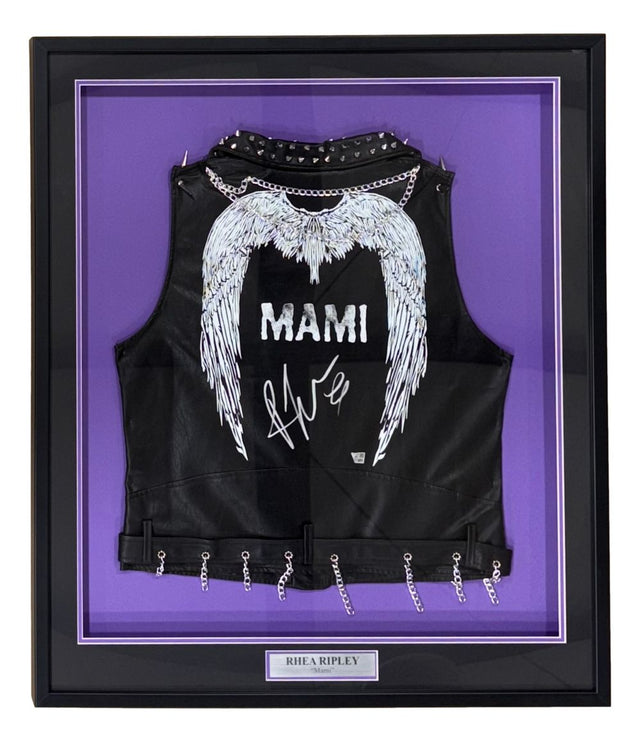 This authentic Rhea Ripley autographed vest has been expertly preserved in a stunning professionally framed and matted display measuring approximately 32x40, making it ready to showcase in your home, office, or fan cave.