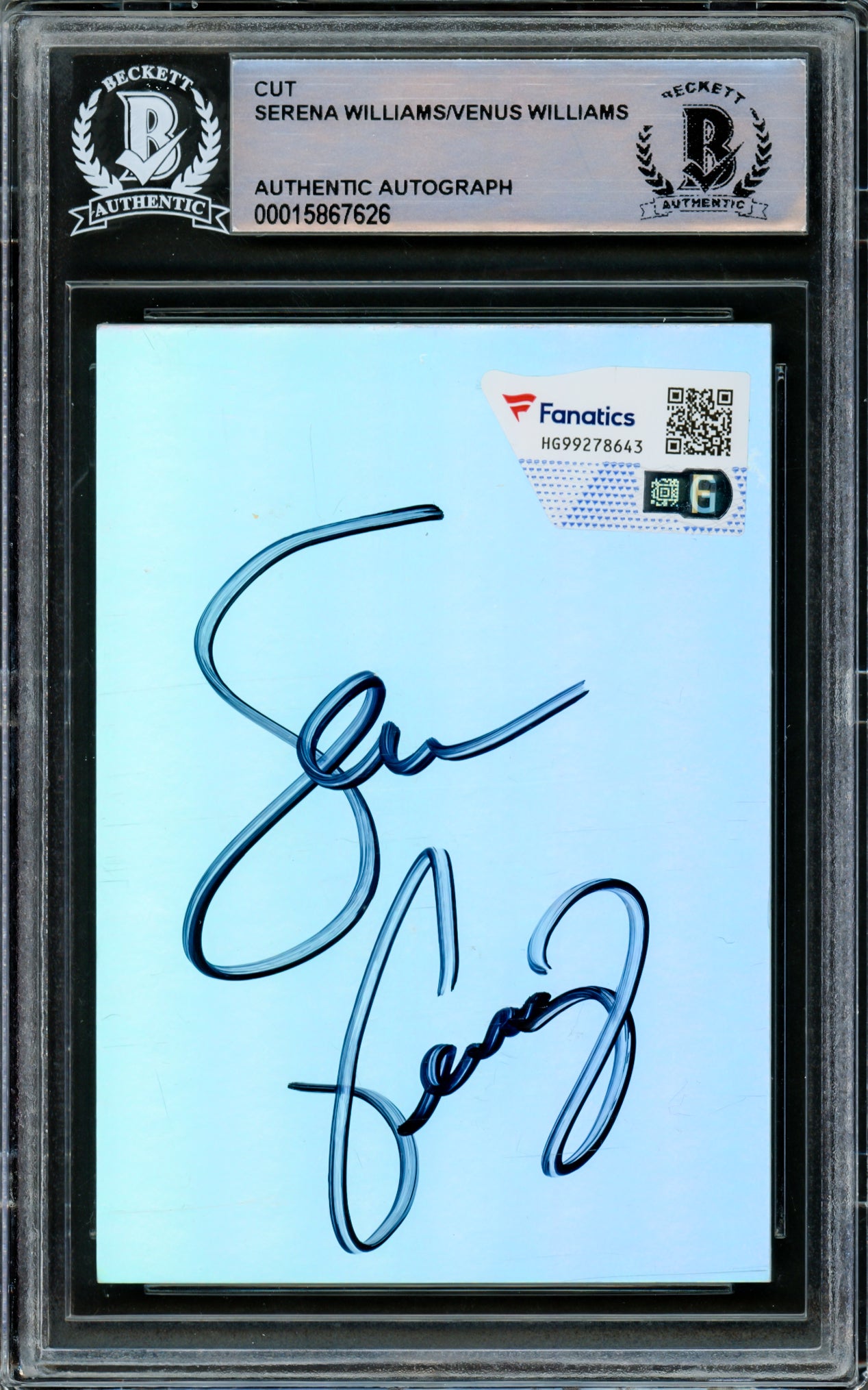 Own a rare piece of tennis history with this Serena & Venus Williams Dual-Signed Cut Signature. Measuring 2.5x3.5 inches, this exclusive collectible features the authentic signatures of two of the greatest tennis players of all time. Certified by Beckett Authentication Services (BAS), this autographed item is encapsulated in a tamper-proof holder for long-lasting preservation.