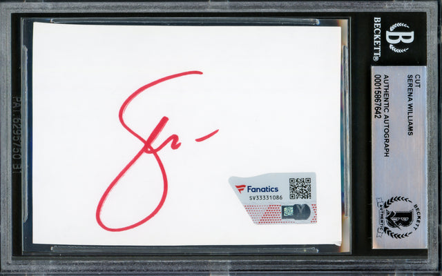 Own a piece of tennis history with this Serena Williams hand-signed 2.5" x 3.5" Cut Signature. A true collectible for fans and memorabilia enthusiasts, this autograph has been certified authentic by Beckett Authentication Services (BAS) and is encapsulated in their tamper-proof holder for long-term preservation.