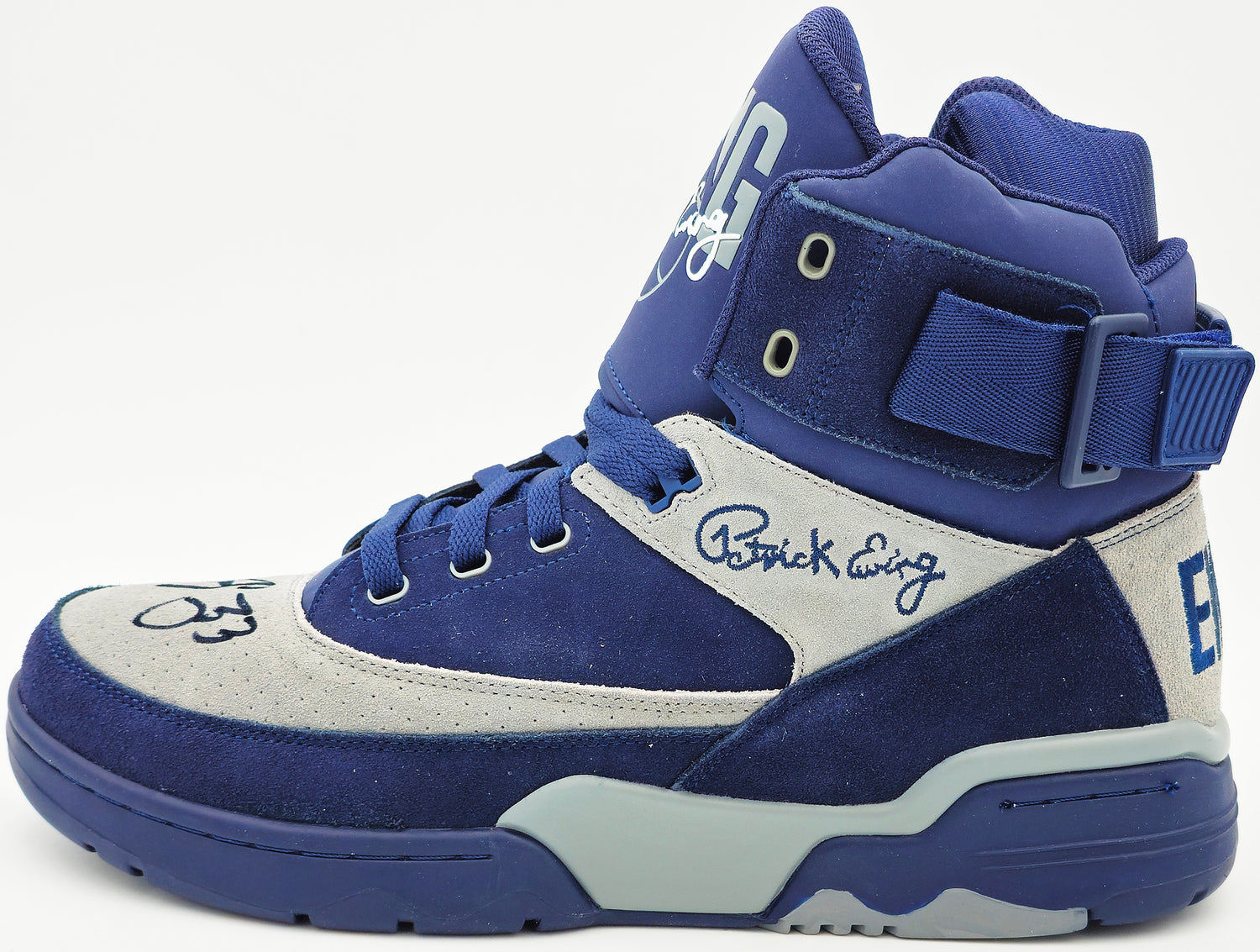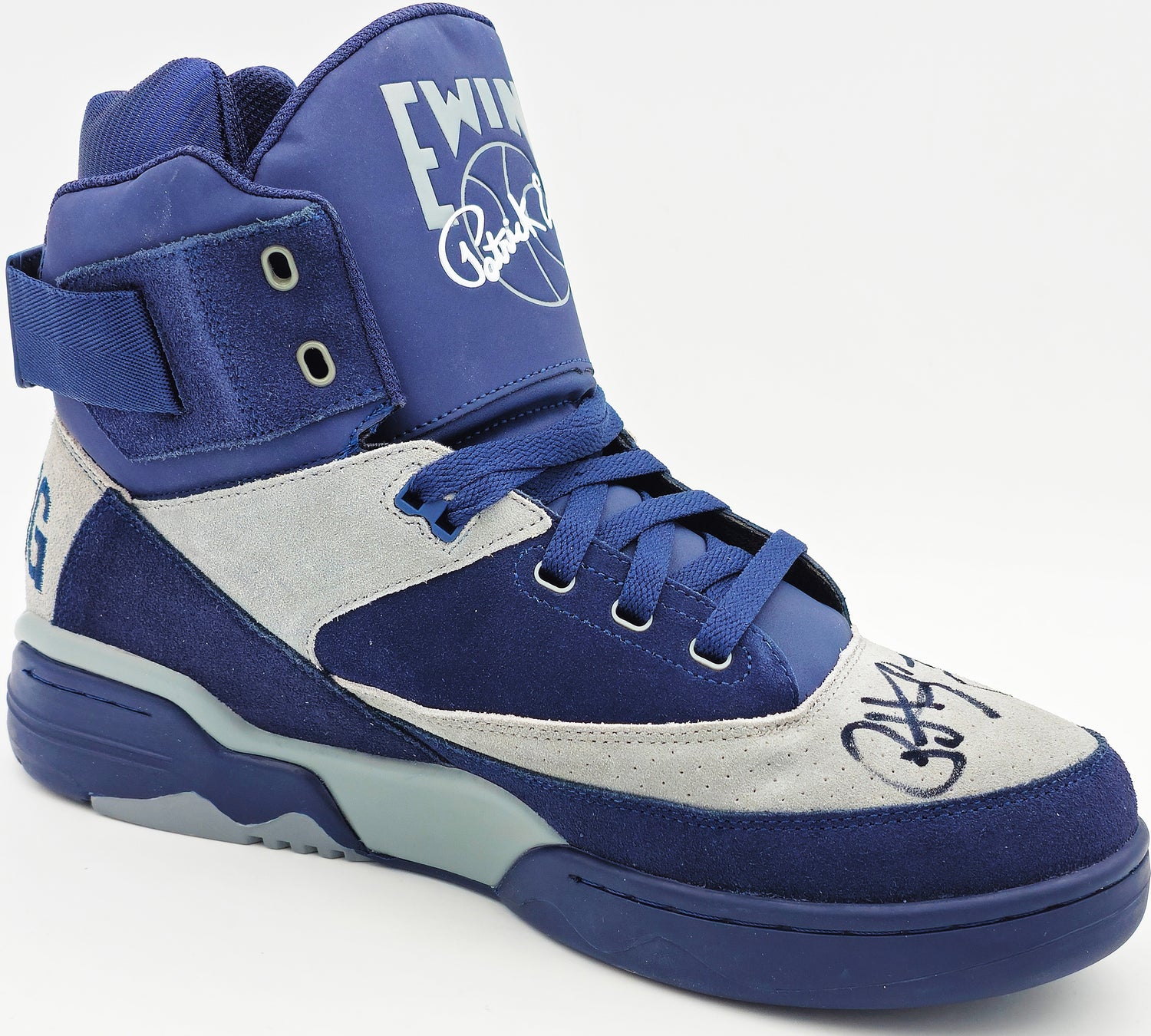 Patrick Ewing Autographed Navy & Grey Ewing Athletics 33 HI OG Left Shoe Georgetown Hoyas Size 13 W/ Box Beckett BAS Witness Stock #236555