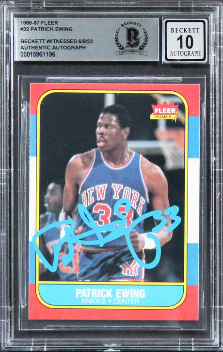 Knicks Patrick Ewing Signed 1986 Fleer #32 RC Card Auto Graded 10! BAS Slabbed 1