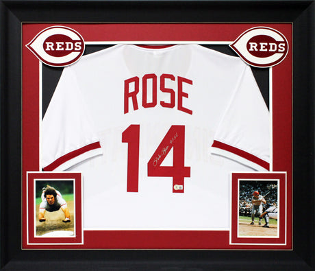 Pete Rose "4256" Signed White Pro Style Framed Jersey w/ Silver Sig BAS Witness