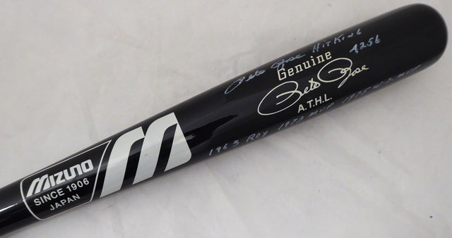 Pete Rose Autographed Black Mizuno Game Model Bat Cincinnati Reds Stat Game Model Bat "Hit King & 4256" In White PR Holo Stock #178273