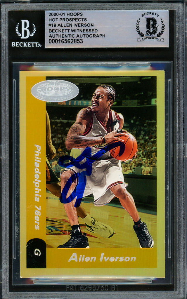 Allen Iverson Autographed 2000-01 Hoops Hot Prospects Card #18 Philadelphia 76ers Beckett BAS Witnessed #16562853