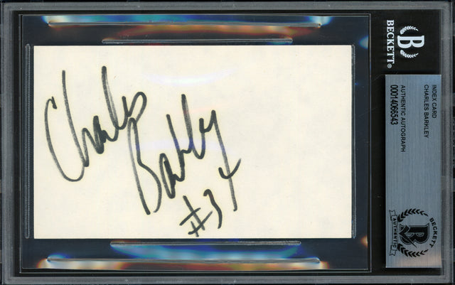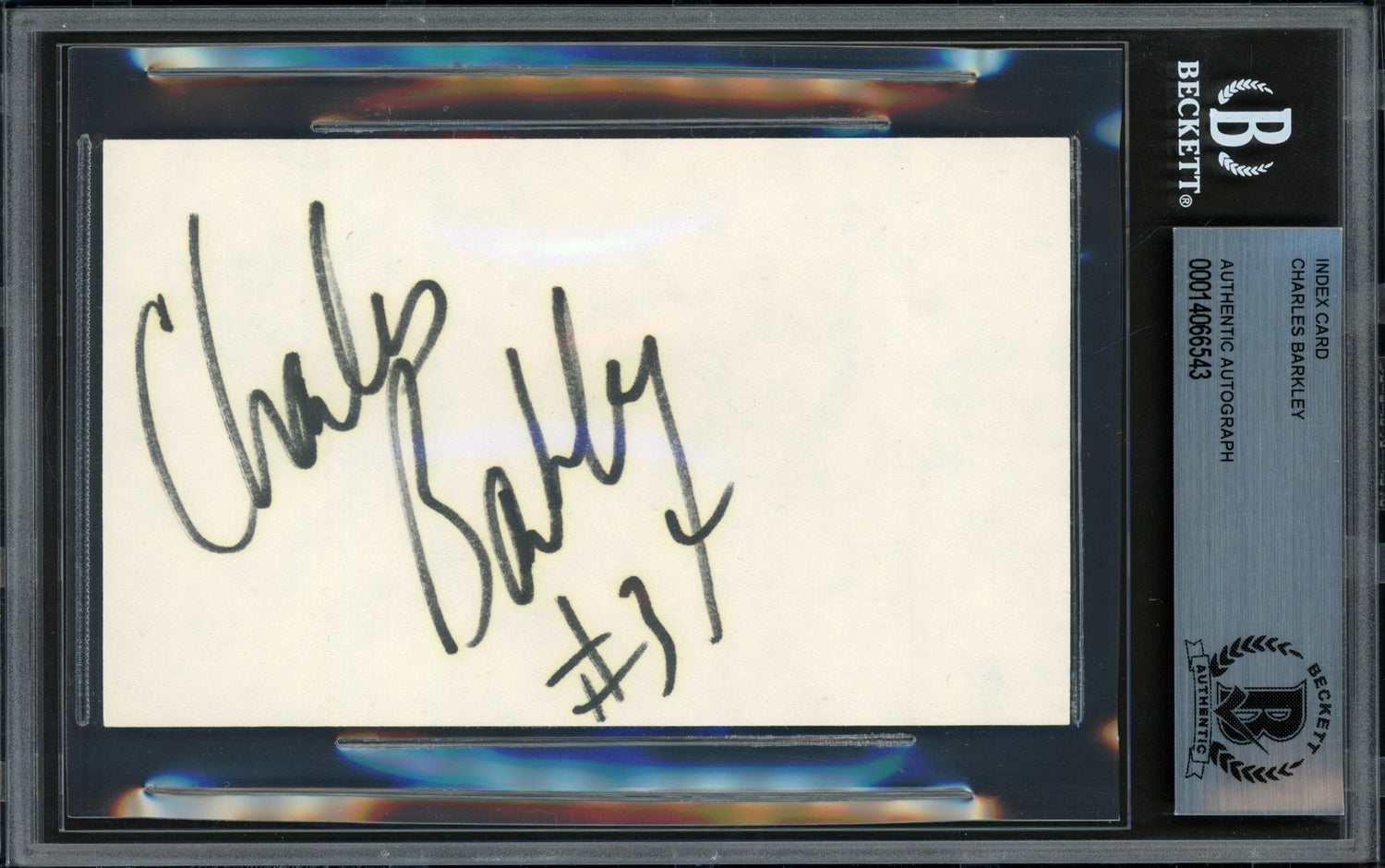 Own a piece of basketball history with this hand-signed 3x5 index card from NBA legend Charles Barkley. This autograph features a vintage signature, making it a rare and valuable collectible for any sports enthusiast. Certified authentic by Beckett Authentication Services (BAS), it comes encapsulated in their tamper-proof holder, ensuring its long-term preservation.