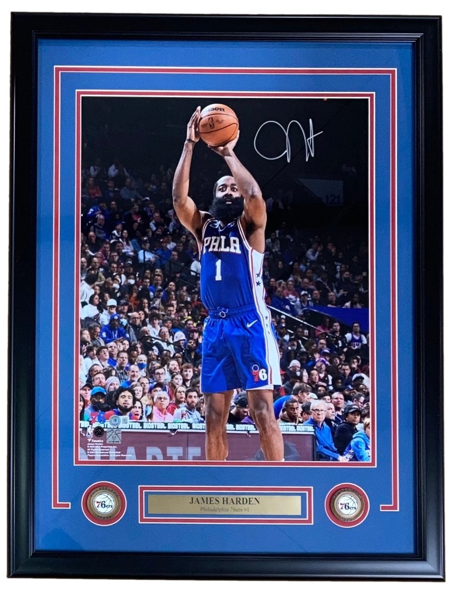 Own a piece of basketball history with this James Harden signed 16x20 Philadelphia 76ers photo. This stunning collectible features an authentic hand-signed autograph from the 10-time NBA All-Star and former league MVP, making it a must-have for any dedicated Philadelphia 76ers fan or sports memorabilia collector. Professionally framed and matted, this display enhances the photo’s visual appeal, making it perfect for showcasing in your home, office, or fan cave.