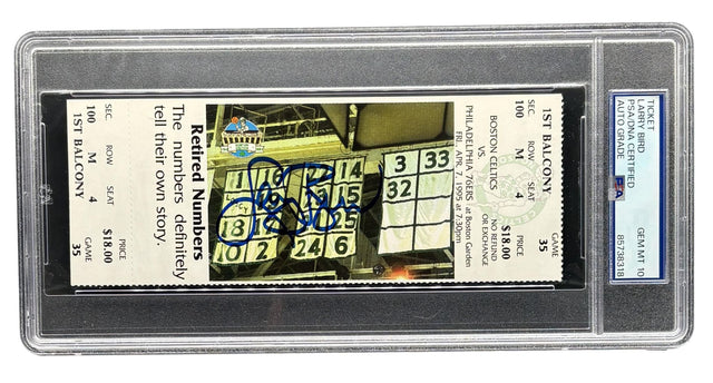 - Item: Full game ticket (Celtics vs. 76ers, April 7, 1995), ink-signed by Larry Bird; PSA/DNA Autograph Grade Gem MT 10; encapsulated