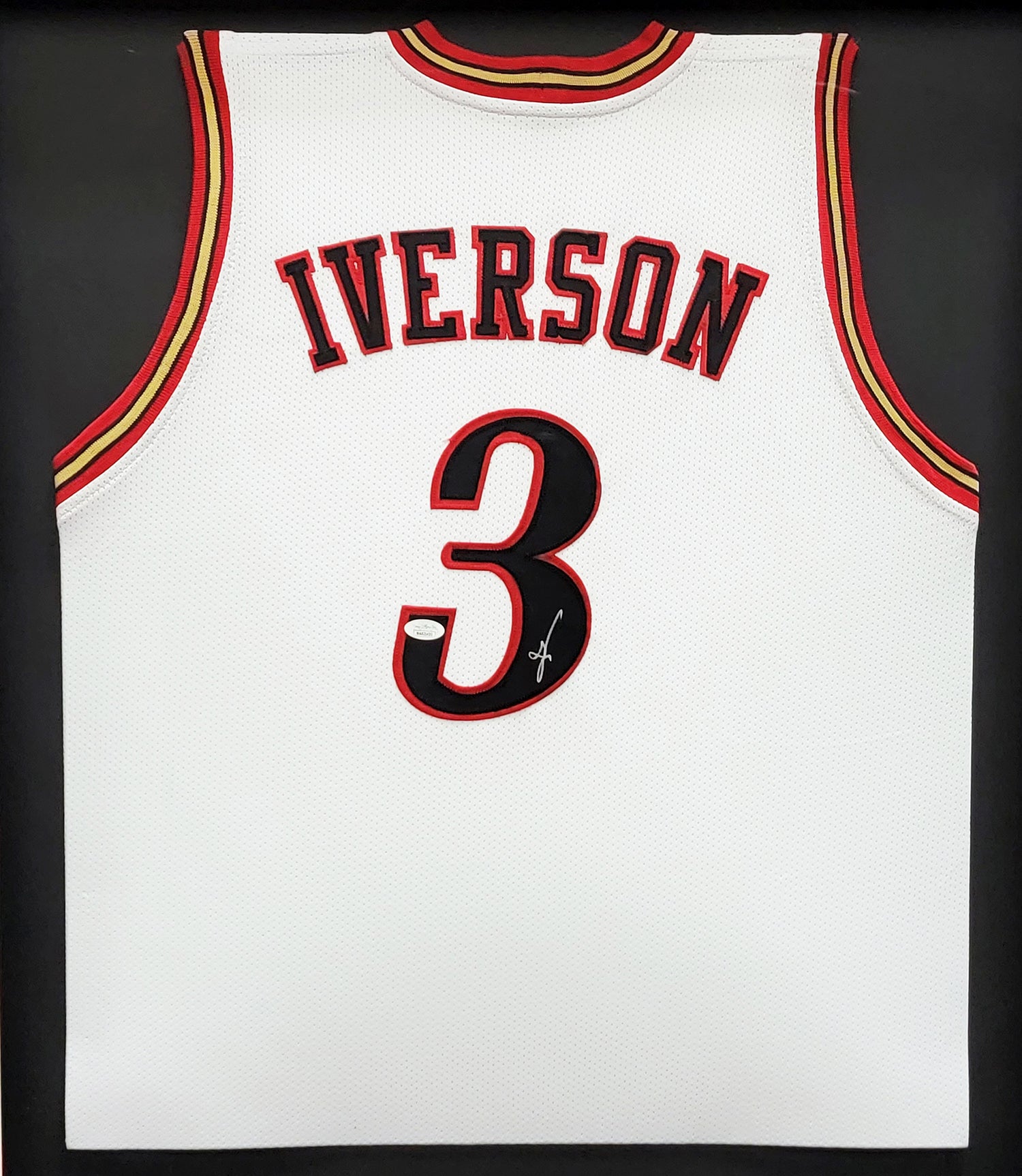 Own a piece of basketball history with this framed Allen Iverson signed white jersey—a must-have for collectors and Philadelphia 76ers fans! This custom jersey, approximately 31x36 inches with the frame, features nicely sewn name and numbers and is approximately XL in size. While this jersey is not an official brand, it has been hand-signed by Allen Iverson, one of the most electrifying players in NBA history.