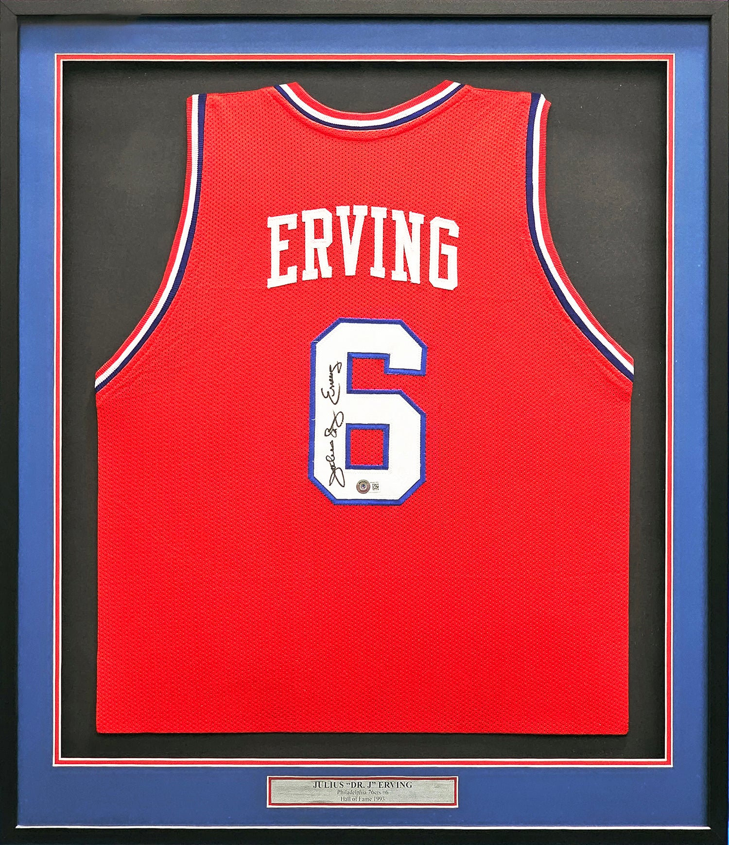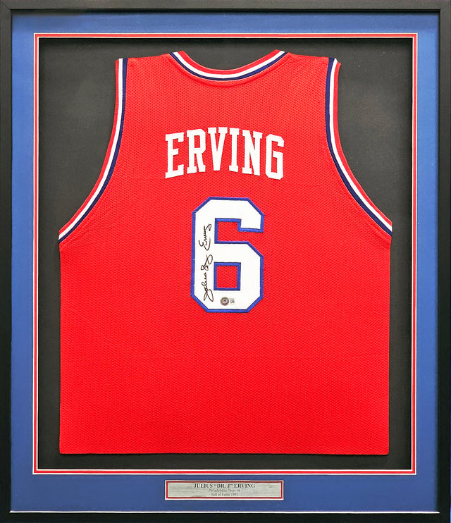 Own a piece of basketball history with this framed Julius "Dr. J" Erving signed Red Jersey—a must-have for dedicated fans and collectors. This professionally framed display measures approximately 31" x 36" and highlights the legacy of one of the greatest players in NBA history.