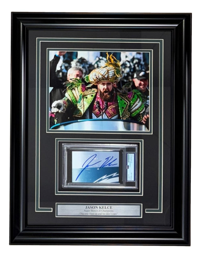 Celebrate a piece of Philadelphia Eagles history with this Jason Kelce signed cut signature, a must-have collectible for any serious NFL fan. This stunning collectible features the authentic autograph of Jason Kelce, the legendary Eagles center known for his pivotal role in leading the team to their first Super Bowl LII Championship. Authenticated and encapsulated by PSA/DNA, this signature offers both provenance and peace of mind for collectors seeking high-quality, genuine memorabilia. Professionally framed and matted, it’s ready to become the centerpiece of your fan cave or office.