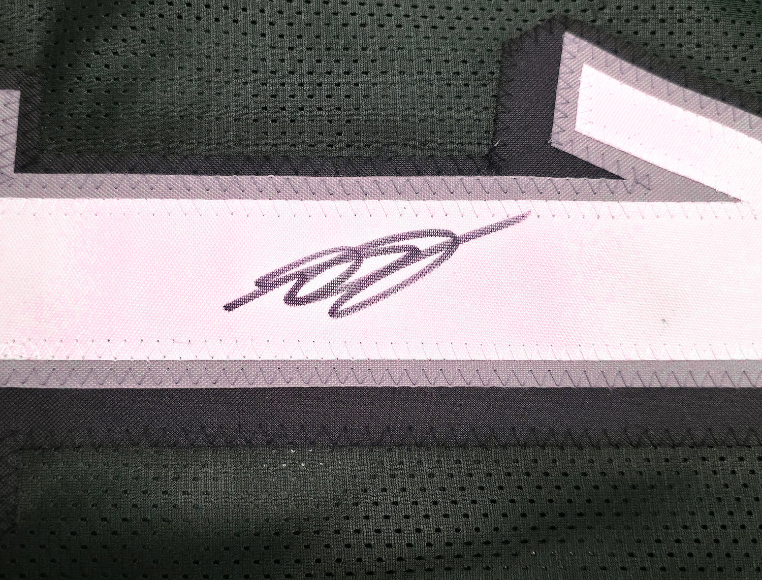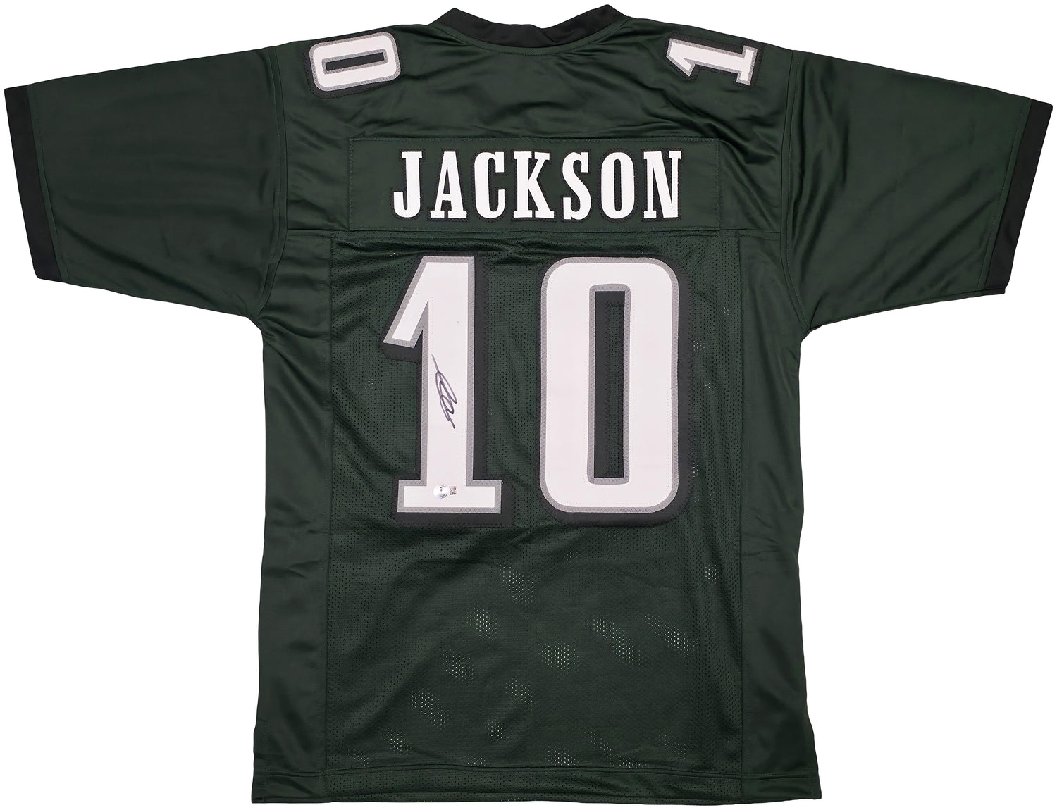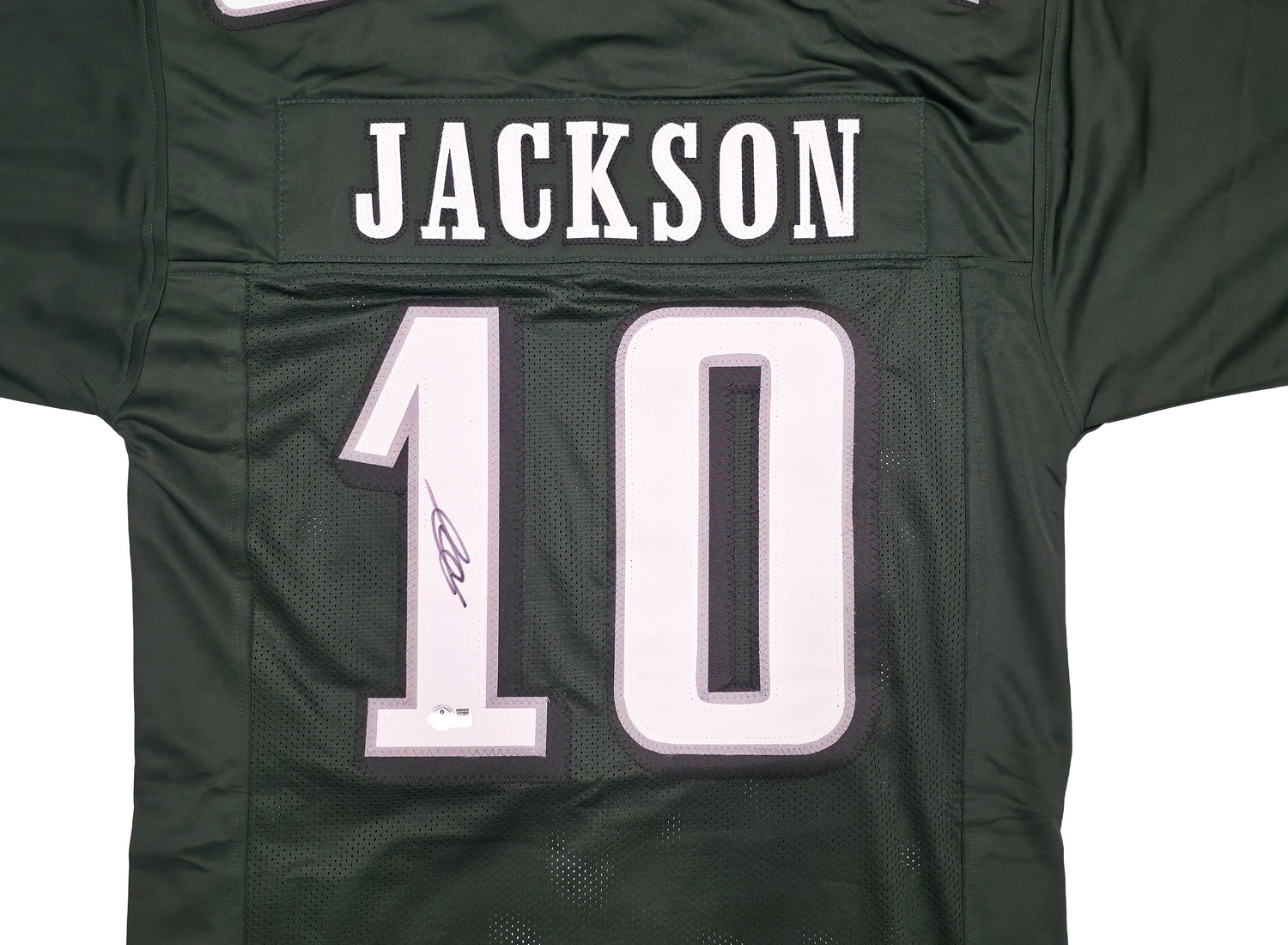 Celebrate one of the most electrifying wide receivers in NFL history with this hand-signed Green Custom Jersey autographed by DeSean Jackson. Known for his explosive speed and iconic game-winning plays, DeSean Jackson thrilled fans during his standout career with multiple teams, including the Philadelphia Eagles and Washington Football Team. This jersey is a must-have for any football lover or sports memorabilia collector looking to own a piece of gridiron greatness. This custom jersey is not affiliated with any brand and is sized approximately XL. It features professionally sewn-in name and numbers, making it an eye-catching display piece for any man cave, game room, or memorabilia collection. With its bold green color and authentic details, it's perfect for showcasing your fandom and appreciation for one of the game’s most exciting players. This item has been authenticated by Beckett Authentication Services (BAS) and includes their tamper-proof witness hologram for guaranteed authenticity, giving collectors total confidence in their investment.
