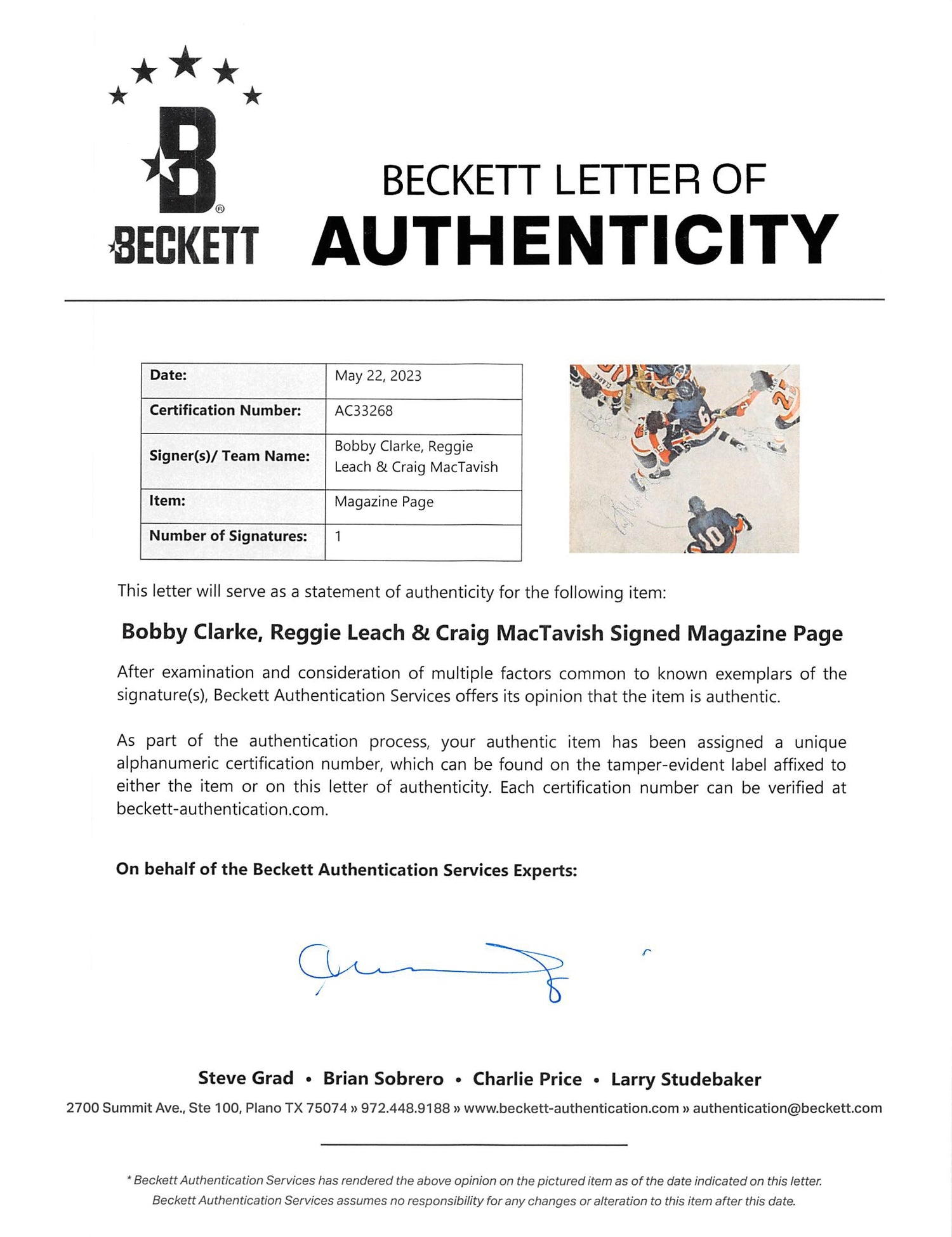 Own a piece of Philadelphia Flyers history with this Autographed 8.5x11 Magazine Page, personally signed by Bobby Clarke, Reggie Leach, and Craig MacTavish. These legendary players left their mark on the hockey world, making this a must-have for any devoted Flyers fan or memorabilia collector.