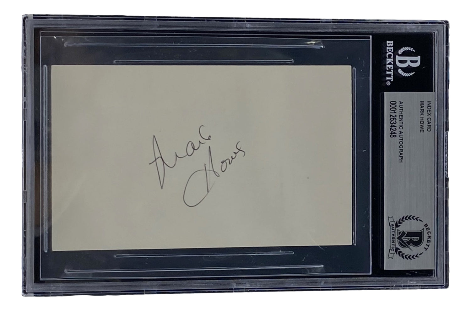 Celebrate hockey history with this Mark Howe Philadelphia Flyers signed index card, a must-have collectible for any die-hard Flyers fan or vintage hockey memorabilia collector. Mark Howe, a Hall of Famer and iconic defenseman, helped define an era with the Philadelphia Flyers and earned his place among NHL greats. This rare piece has been hand-signed by Howe and professionally authenticated and slabbed by Beckett, ensuring long-term preservation and collector-grade authenticity. Whether you're building a shrine to hockey legends or looking for the perfect gift, this signed card delivers both nostalgia and sports legacy.