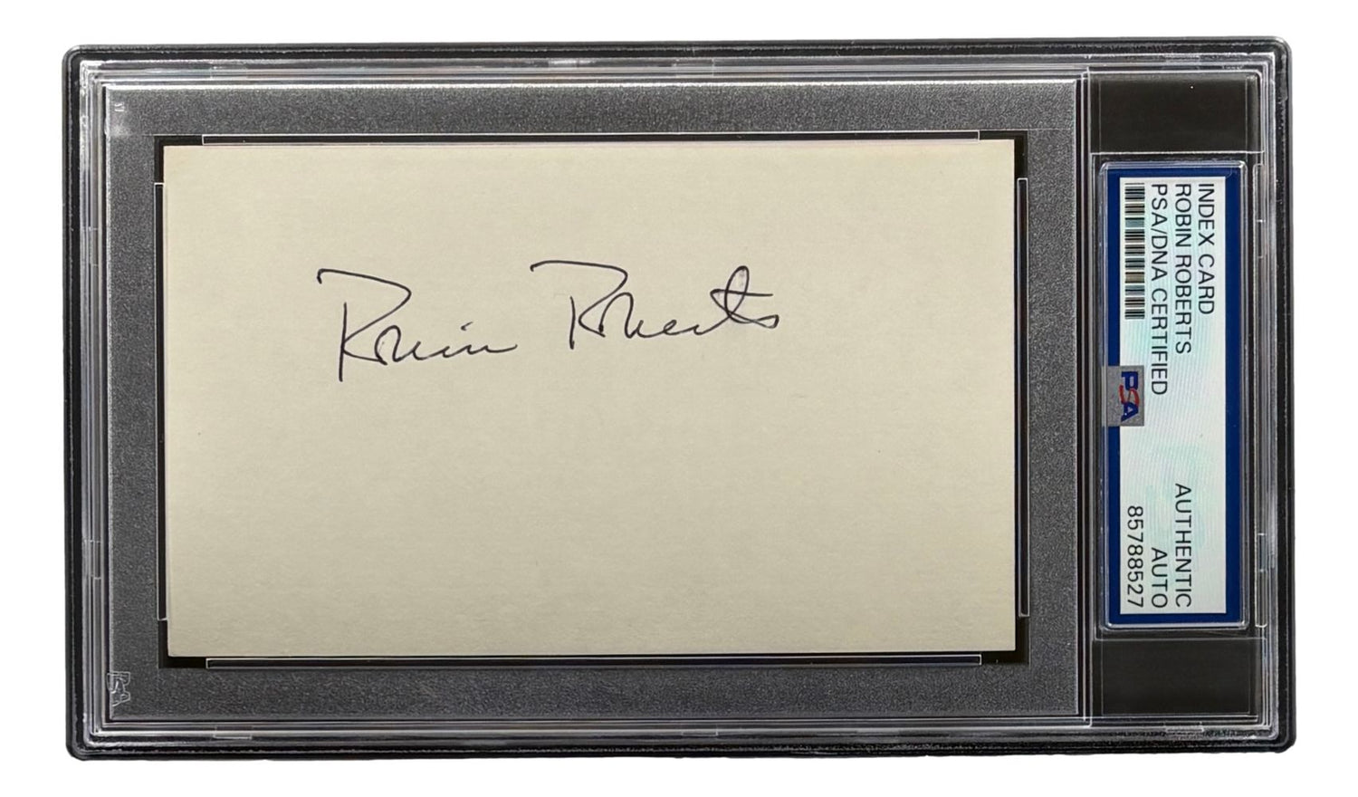 Collector Grade autographed, signed memorabilia: Robin Roberts Philadelphia Phillies 3x5 index card, PSA/DNA authenticated and encapsulated Roberts was inducted into the National Baseball Hall of Fame in 1976, led the 1950 “Whiz Kids” Phillies to the NL pennant, and earned seven All-Star selections. He logged six straight 20-win seasons at his peak, securing his place among the game’s great workhorse aces.