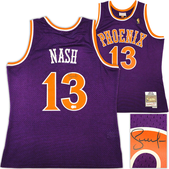Own a piece of Phoenix Suns history with this Purple Authentic Mitchell & Ness Phoenix Suns 2005-06 Hardwood Classic Swingman Jersey, hand-signed by legendary point guard Steve Nash. A must-have for collectors and fans alike, this jersey pays tribute to Nash’s incredible career, including his back-to-back NBA MVP seasons (2004-05, 2005-06), where he led the Suns with his elite playmaking and leadership.