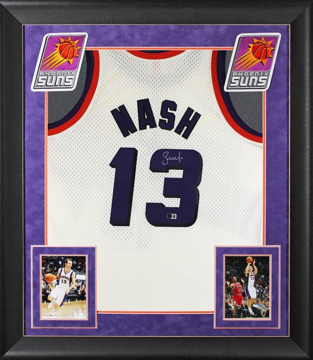 Celebrate the legacy of one of basketball’s most iconic point guards with this Autographed Cream Mitchell & Ness 1996-97 Hardwood Classics Swingman Framed Jersey, personally signed by Steve Nash of the Phoenix Suns. Perfect for any serious collector or Suns fan, this authentic piece pays tribute to Nash's breakout years with the franchise and his eventual rise to two-time NBA MVP. Expertly framed and certified by one of the most trusted names in memorabilia authentication—Beckett Authentication Services (BAS)—this jersey blends historic significance with display-ready quality that adds standout value to your collection or game room wall.