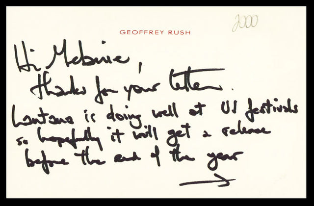 - Authentic Geoffrey Rush signature on an original 4x6.25 note written on his personal letterhead
