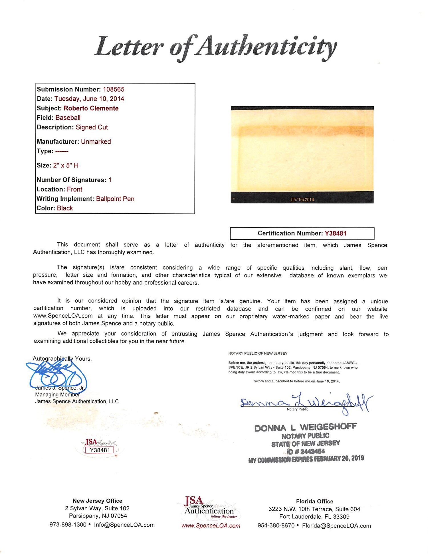 Pirates Roberto Clemente Signed & Framed 1.75x3.5 Cut Signature JSA #Y38481