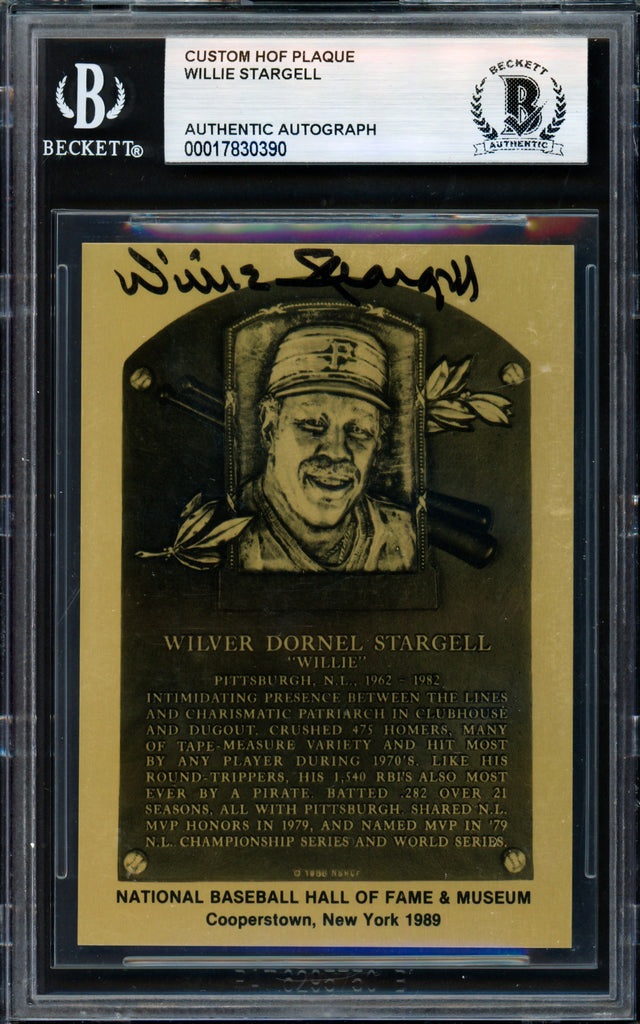 This collectible piece is a must-have for any Pittsburgh Pirates fan or vintage baseball memorabilia collector. It features a 1989 Hall of Fame Metallic Plaque Card, approximately 2.5”x3”, hand signed by legendary slugger Willie Stargell. A dominant force in Major League Baseball during his 21-year career with the Pittsburgh Pirates, Willie Stargell was a seven-time All-Star, 1979 NL MVP, and the heart and soul of the Pirates' 1979 World Series championship team. His leadership and clutch hitting made him one of the most beloved figures in baseball history. This signed Plaque Card celebrates Stargell’s 1988 induction into the National Baseball Hall of Fame and has been certified authentic by Beckett Authentication Services (BAS). The autograph is securely encapsulated in BAS’s tamper-proof holder, providing lasting protection and peace of mind for collectors.
