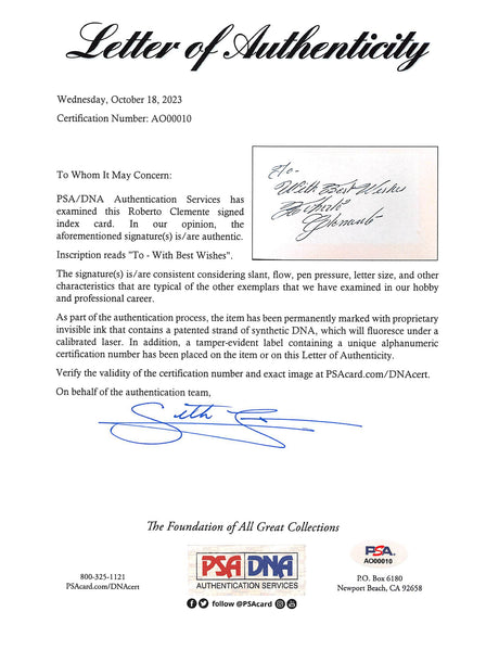 Pirates Roberto Clemente "With Best Wishes" Signed 3x5 Index Card BAS & PSA/DNA