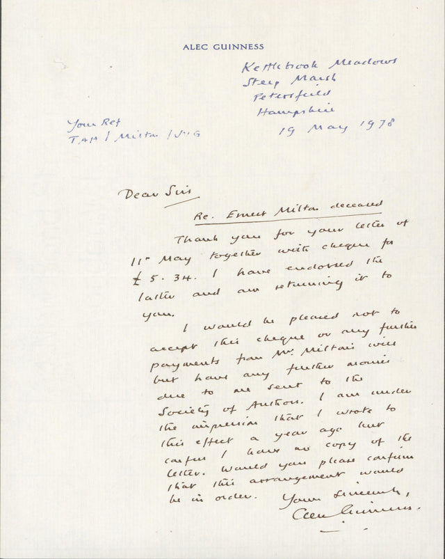 Own a rare piece of cinematic history with this Autographed Handwritten Letter, personally signed and dated May 19, 1978, by legendary actor Alec Guinness —best known for portraying Obi-Wan Kenobi in Star Wars. This exceptional collectible is a must-have for memorabilia enthusiasts and fans of the iconic franchise.
