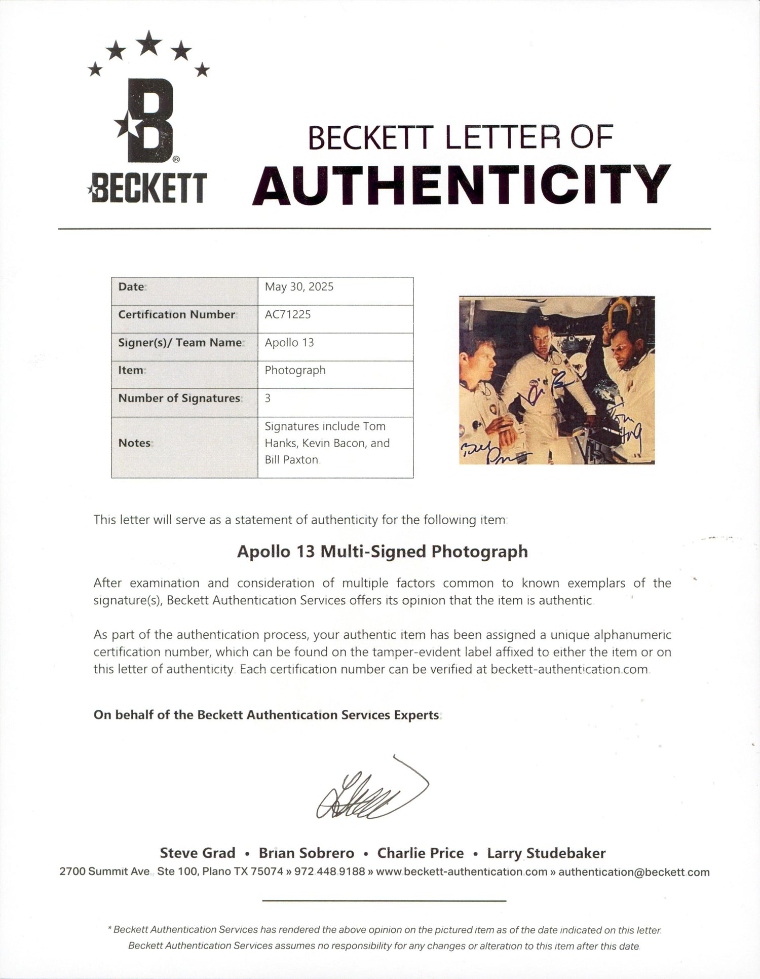 - Personally signed by Tom Hanks, Kevin Bacon, and Bill Paxton – stars of the acclaimed film Apollo 13