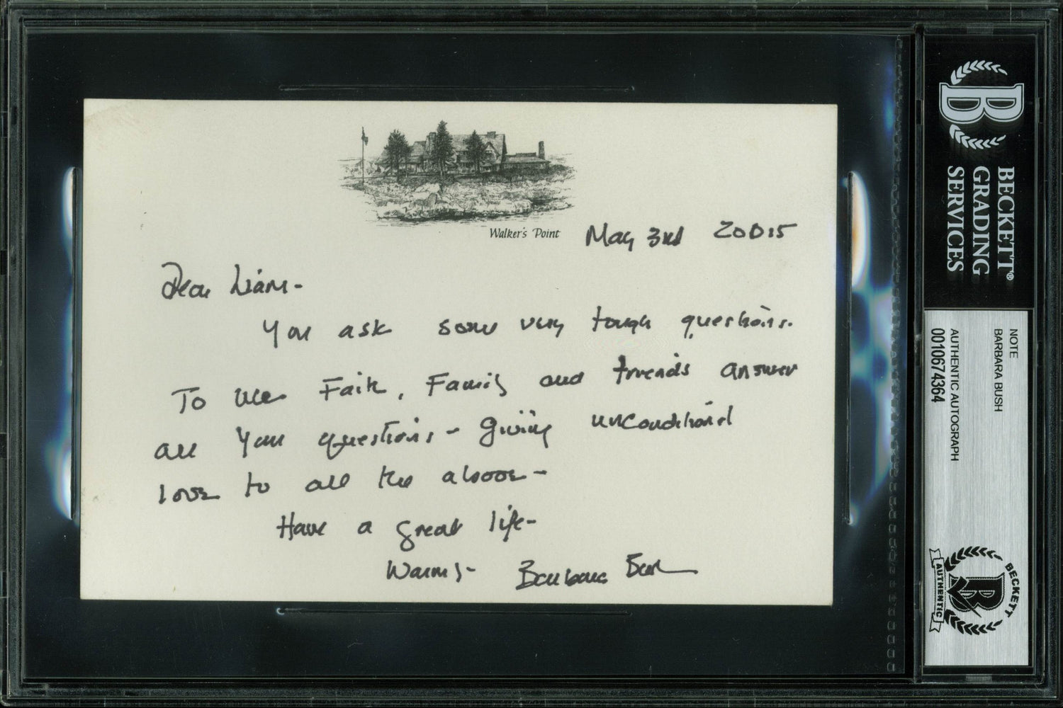 Own a rare piece of history with this Autographed 4.25x6.5 Note, dated May 3rd, 2015, personally signed by former First Lady Barbara Bush. A cherished keepsake for collectors of political and historical memorabilia, this note reflects her wisdom and heartfelt sentiments. Authenticated and securely slabbed by Beckett Authentication Services, ensuring its 100% authenticity.