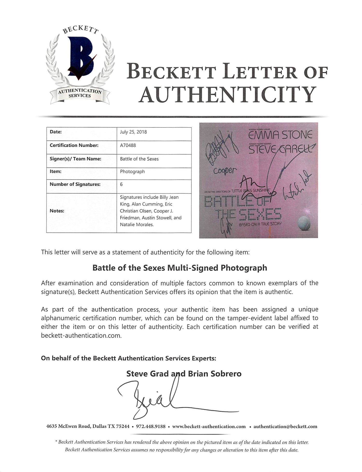 • Authentic Signatures – Personally signed by Billie Jean King, Alan Cumming, Eric Christian Olsen, Cooper J. Friedman, Austin Stowell, and Natalie Morales.