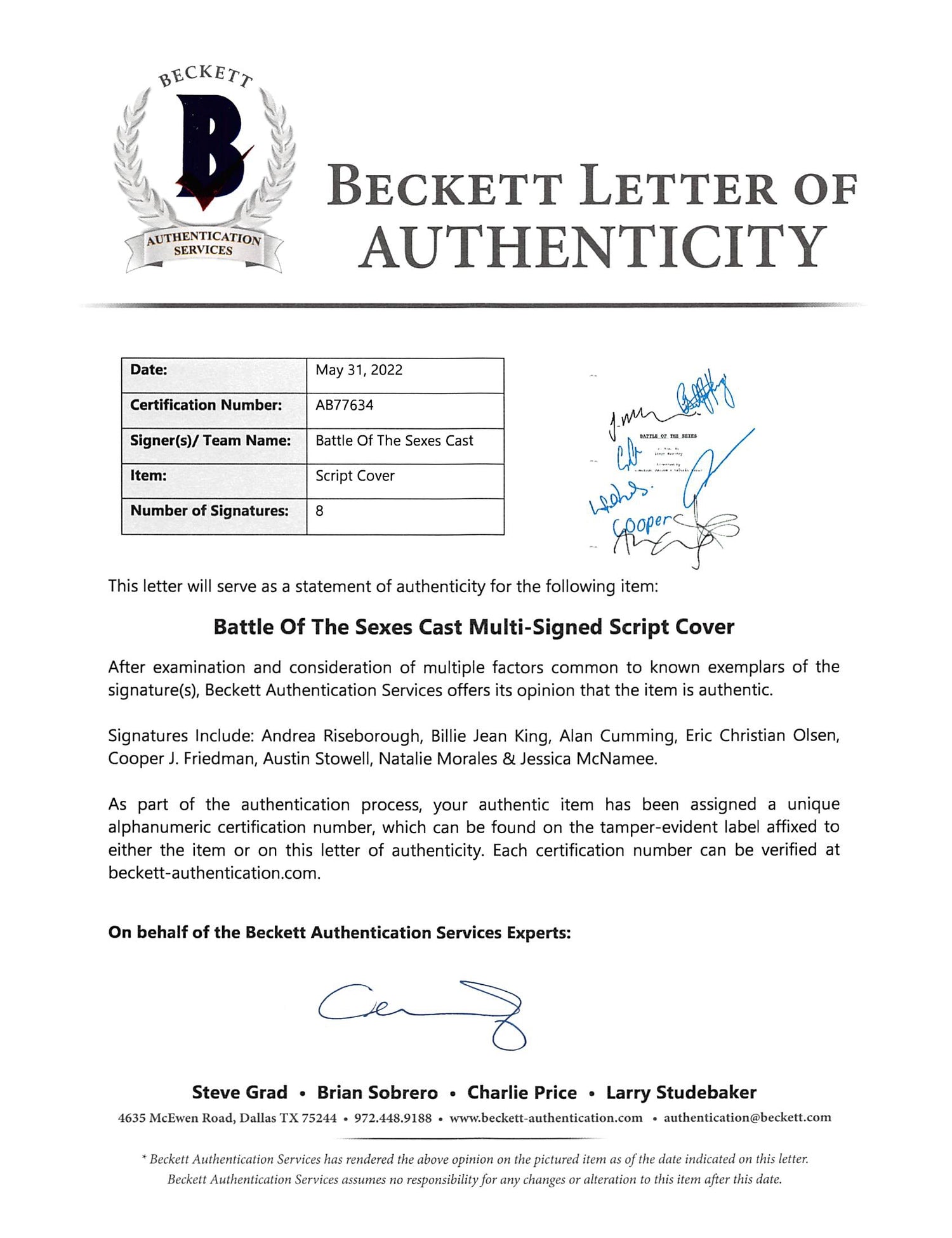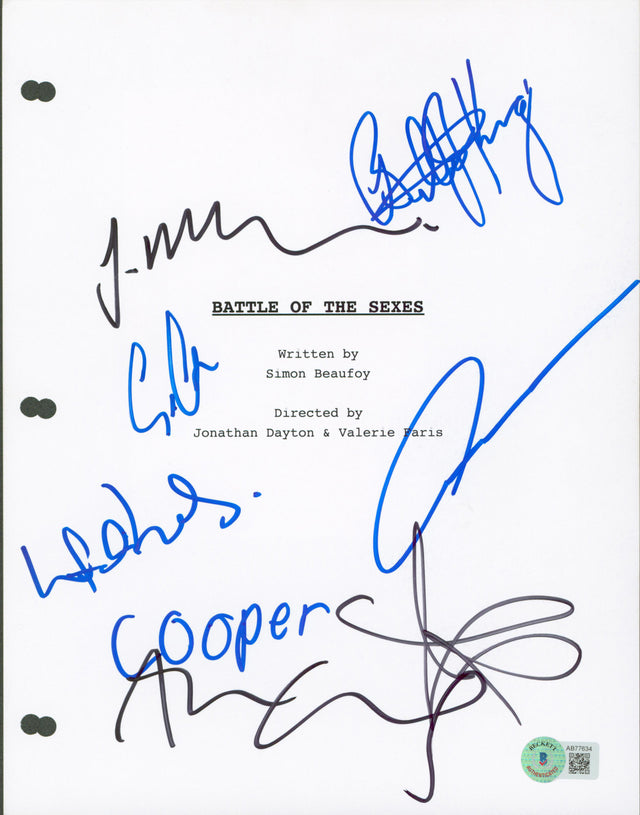 Own a rare piece of cinematic and sports history with this Autographed Battle of the Sexes 8.5x11 Script Cover, personally signed by a star-studded lineup, including Andrea Riseborough, Billie Jean King, Alan Cumming, Eric Christian Olsen, Cooper J. Friedman, Austin Stowell, Natalie Morales, and Jessica McNamee. A must-have collectible for film buffs and tennis enthusiasts, this item celebrates the 2017 biographical drama that brought the legendary 1973 match between Billie Jean King and Bobby Riggs to the big screen.