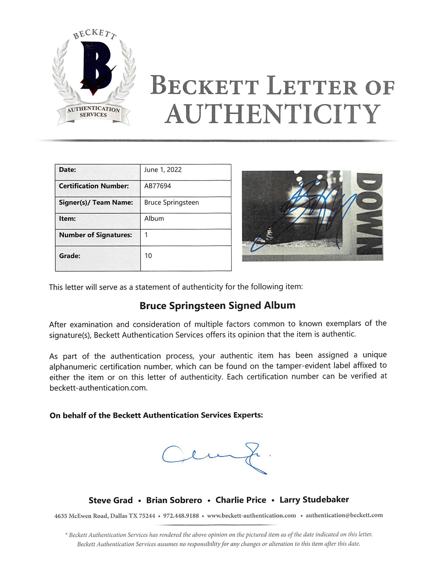 This signed album cover captures the essence of Bruce Springsteen's legendary career, making it an unforgettable treasure for any collector. Secure this 100% authentic, Beckett-certified piece today!