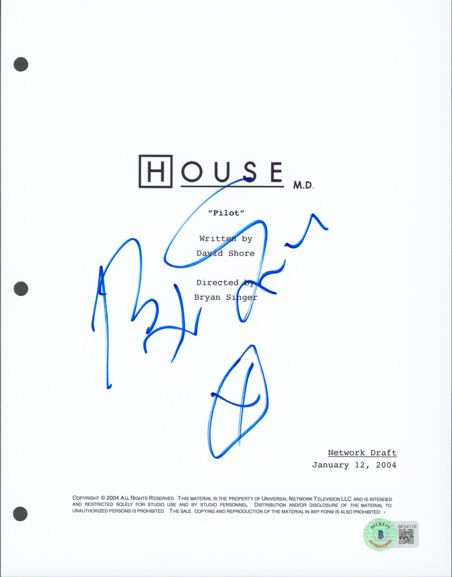 Own a piece of television history with this Autographed House 8.5x11 Script Cover, personally signed by Bryan Singer, the acclaimed director and producer behind the hit medical drama House. This unique collectible is a must-have for fans of the iconic series and serious memorabilia enthusiasts.