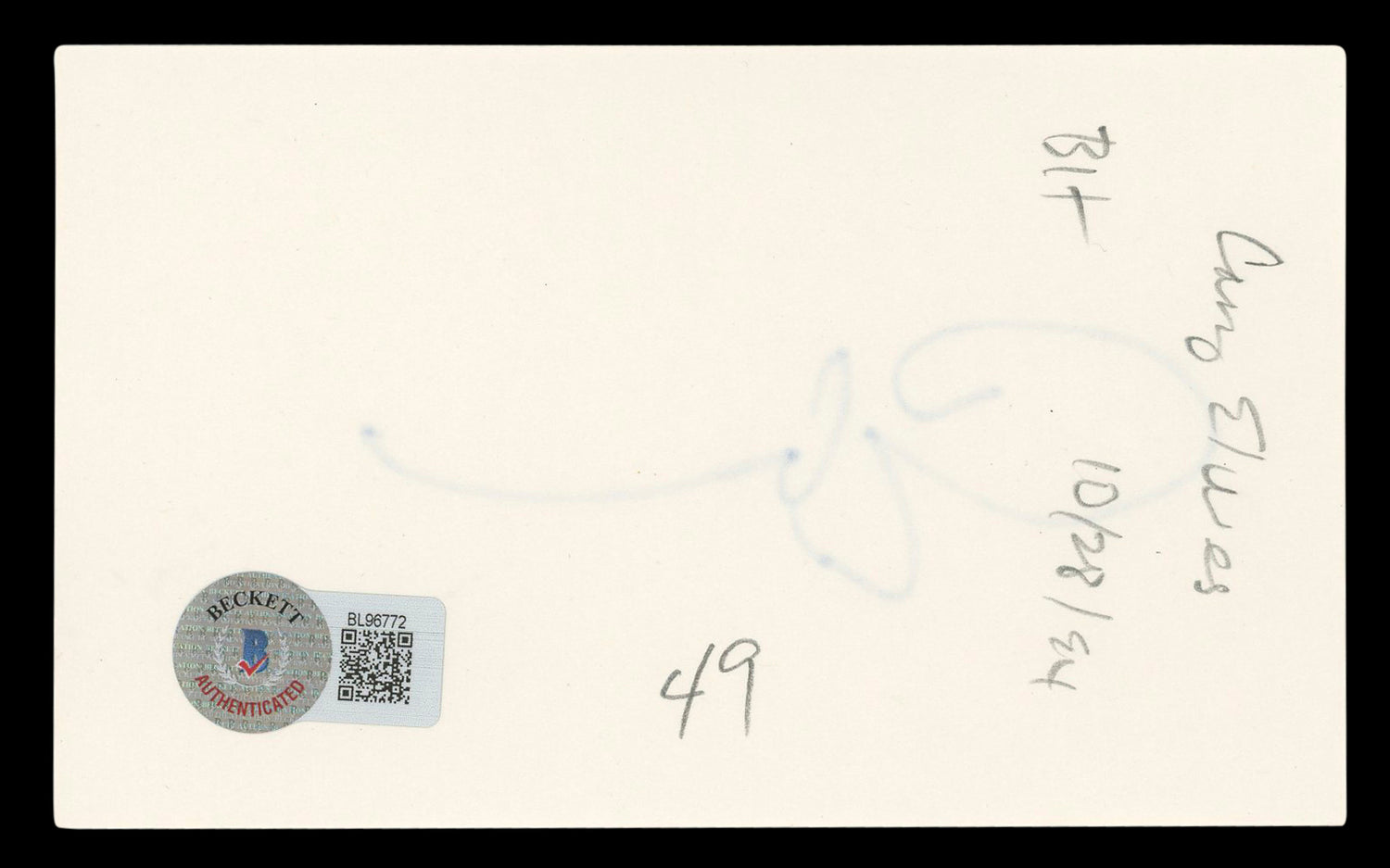 - Beckett Authentication: The index card comes with an affixed BAS authentication sticker, which features a scannable QR code for instant verification on Beckett’s official website.