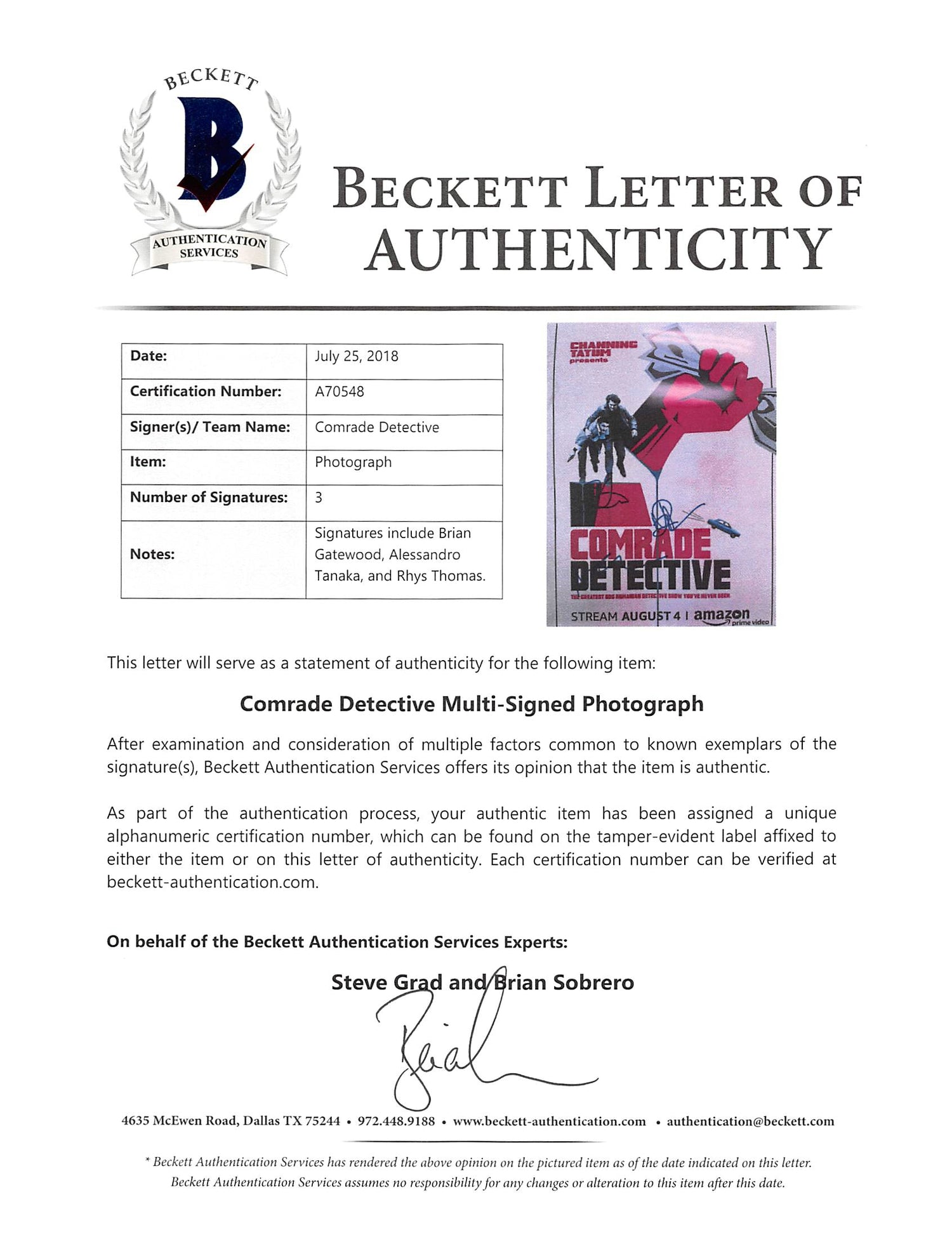 Comrade Detective (3) Gatewood, Tanaka & Thomas Signed 8x10 Photo BAS #A70548 is backordered and will ship as soon as it is back in stock.