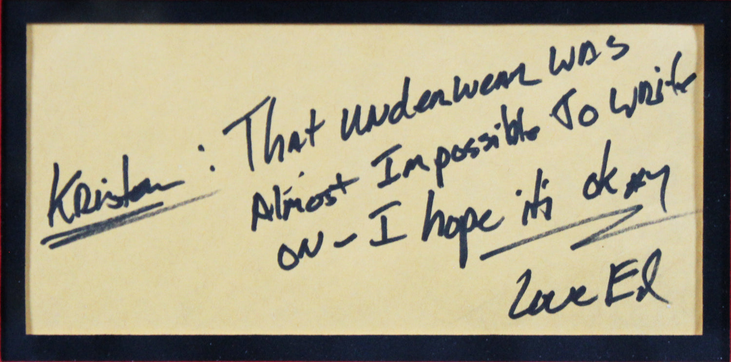 • Handwritten Yellow Cut Note (7" x 3") – Features Eddie’s humorous message: "Krista that underwear was almost impossible to write on I hope it's ok. Love, Ed."