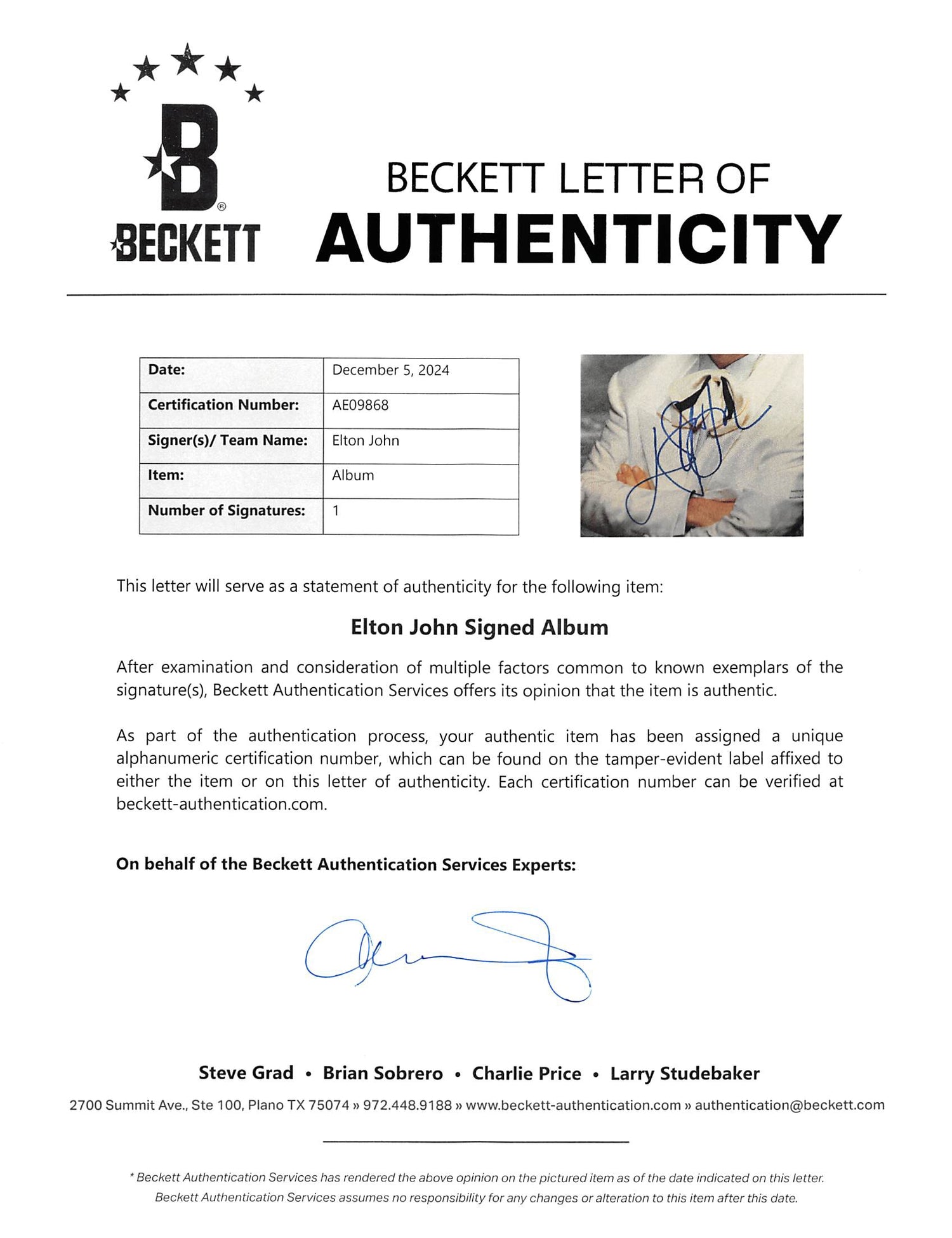• Verify authenticity online – The signature’s authenticity can be confirmed directly on the Beckett Authentication Services website.