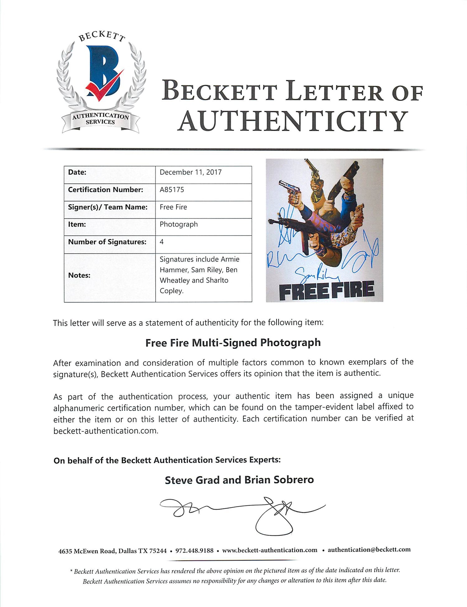 Free Fire (Hammer, Riley, Wheatley +1) Authentic Signed 11x14 Photo BAS #A85175