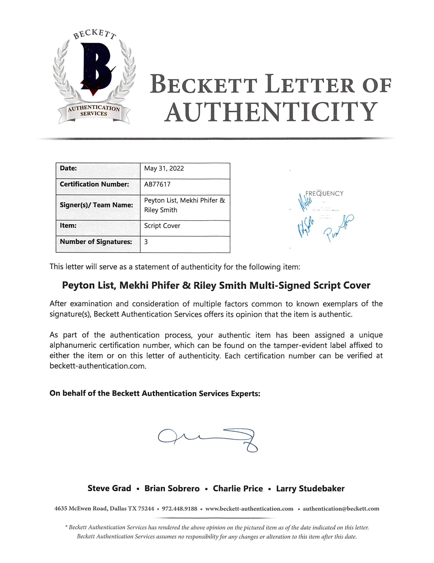 Frequency (3) List, Phifer, Smith Authentic Signed Script Cover BAS #AB77617
