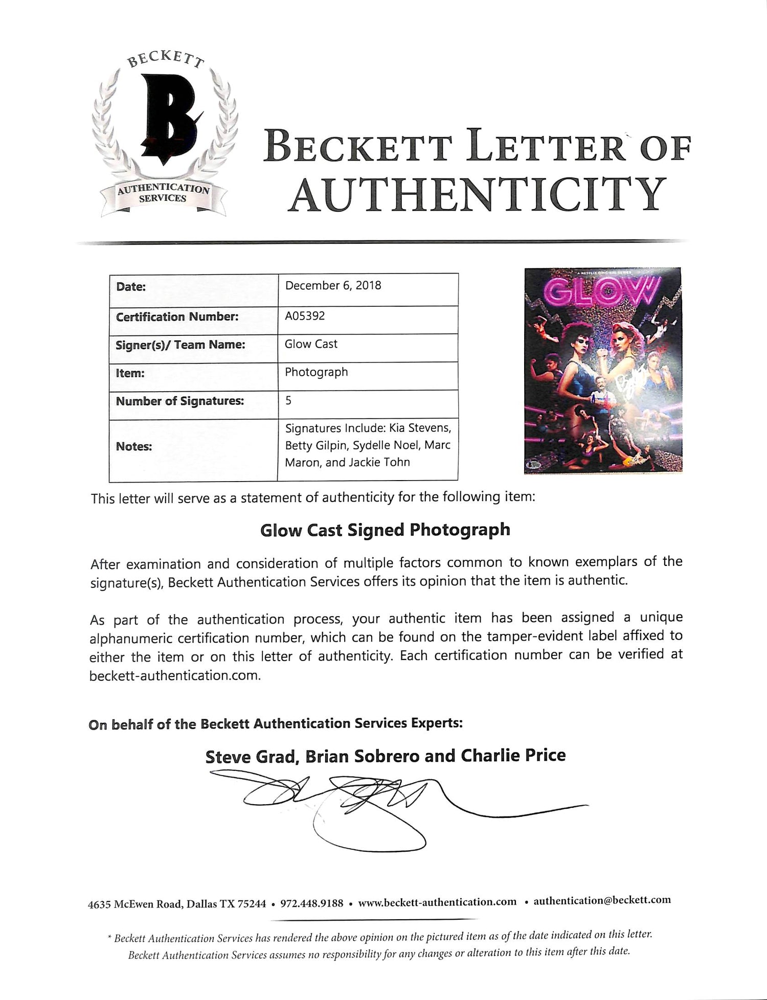 Whether you're a dedicated GLOW fan, a collector of pop culture memorabilia, or searching for the perfect gift, this signed 11x14 photo is a must-have piece. Authenticity can be verified through Beckett Authentication Services' official website. Don't miss your chance to own this one-of-a-kind collectible!