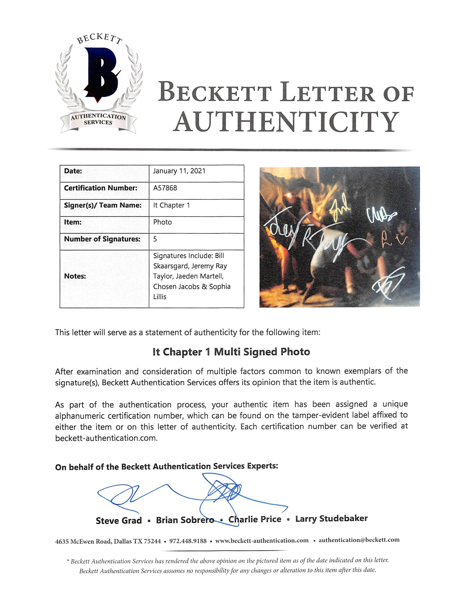 Authenticate this stunning signed IT photo on the Beckett Authentication Services website, ensuring its legitimacy. Whether you're a longtime horror fan, a Stephen King enthusiast, or a dedicated memorabilia collector, this piece is a fantastic addition to any collection. Secure this rare autographed photo today!
