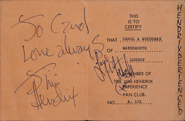This is more than an autograph — it’s a connection to a milestone moment in music history. The Jimi Hendrix Fan Club of Great Britain launched in May 1967 to coincide with the release of Hendrix’s groundbreaking debut album, “Are You Experienced”. This booklet, featuring membership No. A101 assigned to a London-based fan, is one of the earliest issued and the only known signed example in existence.