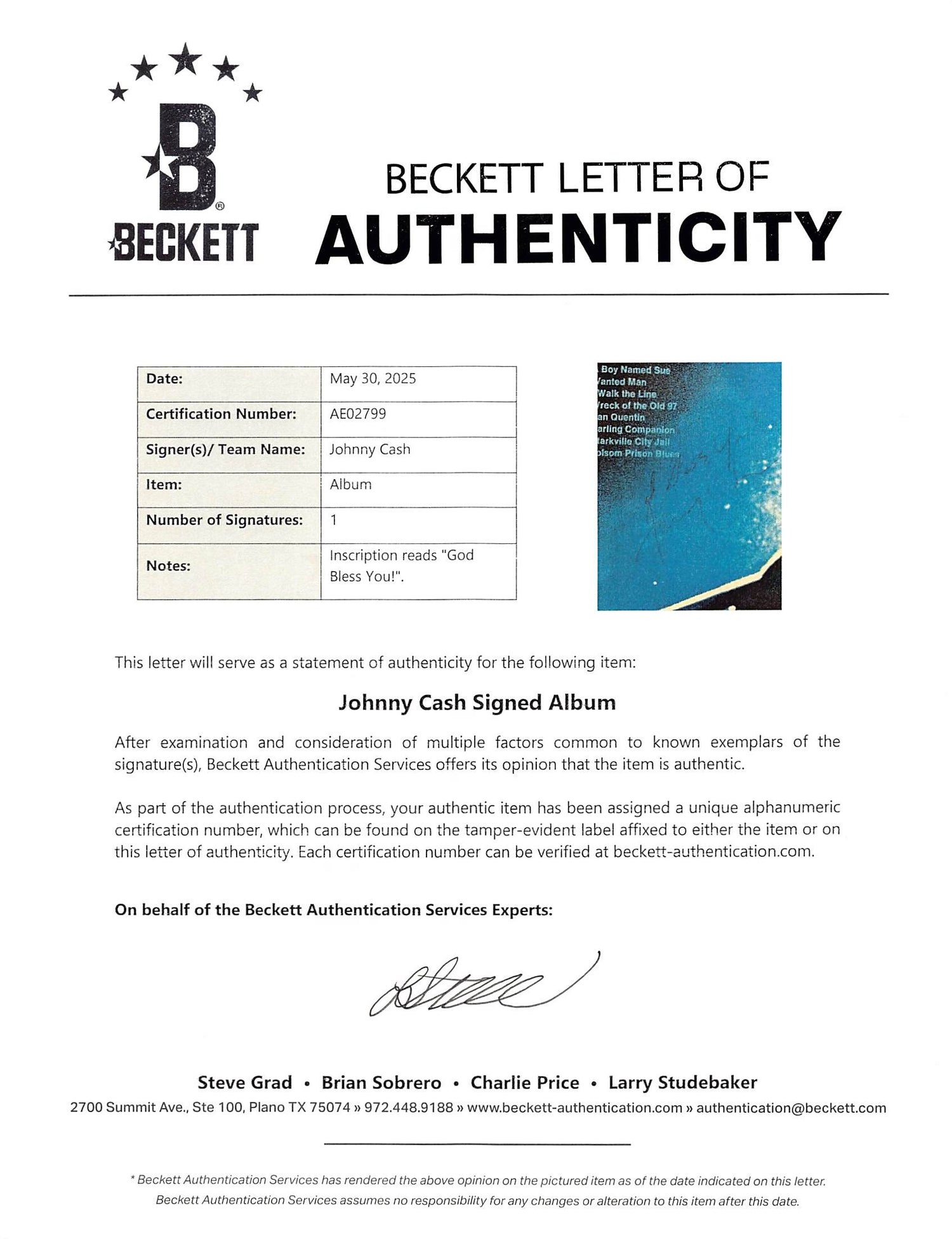- Personally signed by Johnny Cash, complete with the inscription "God Bless You!"