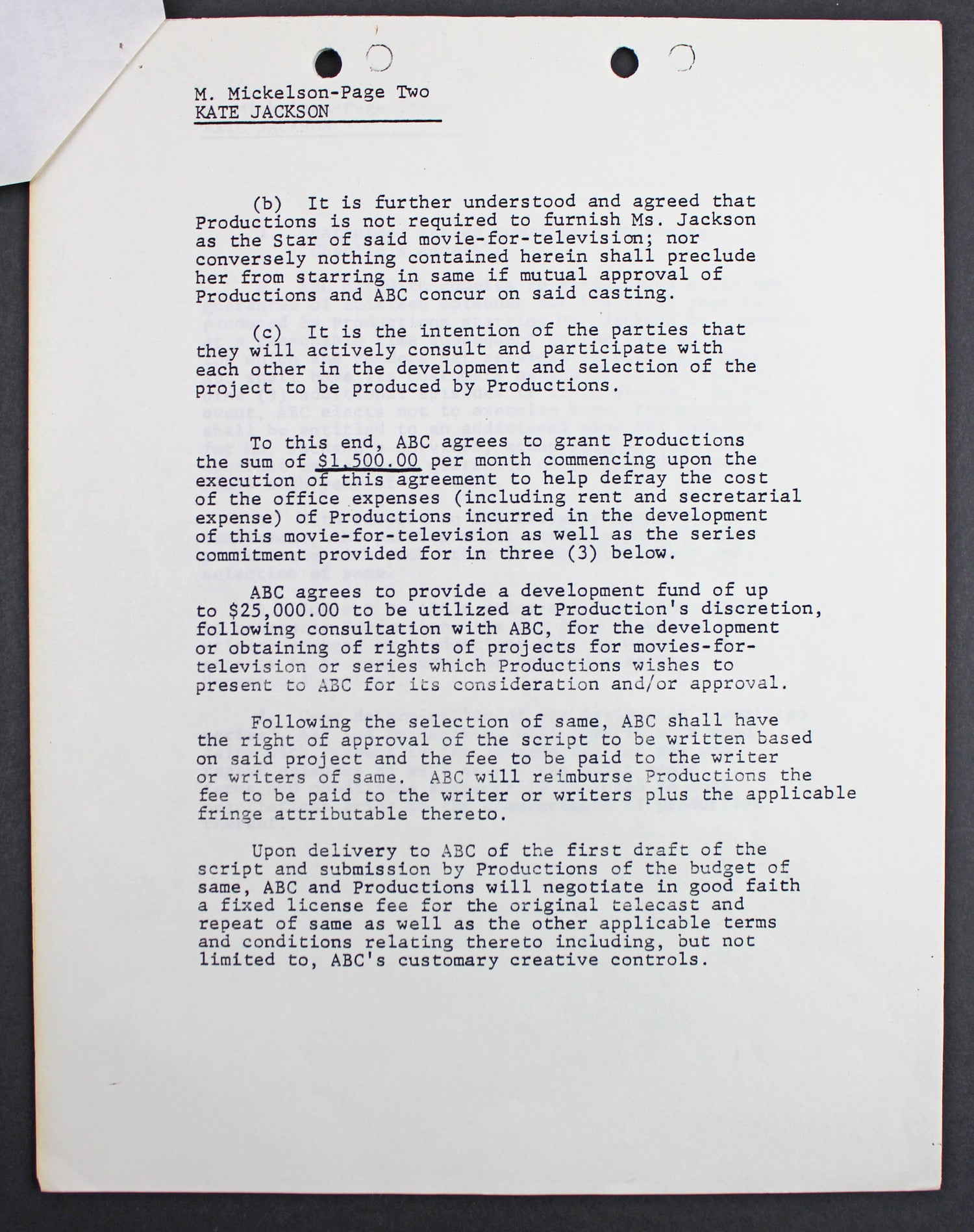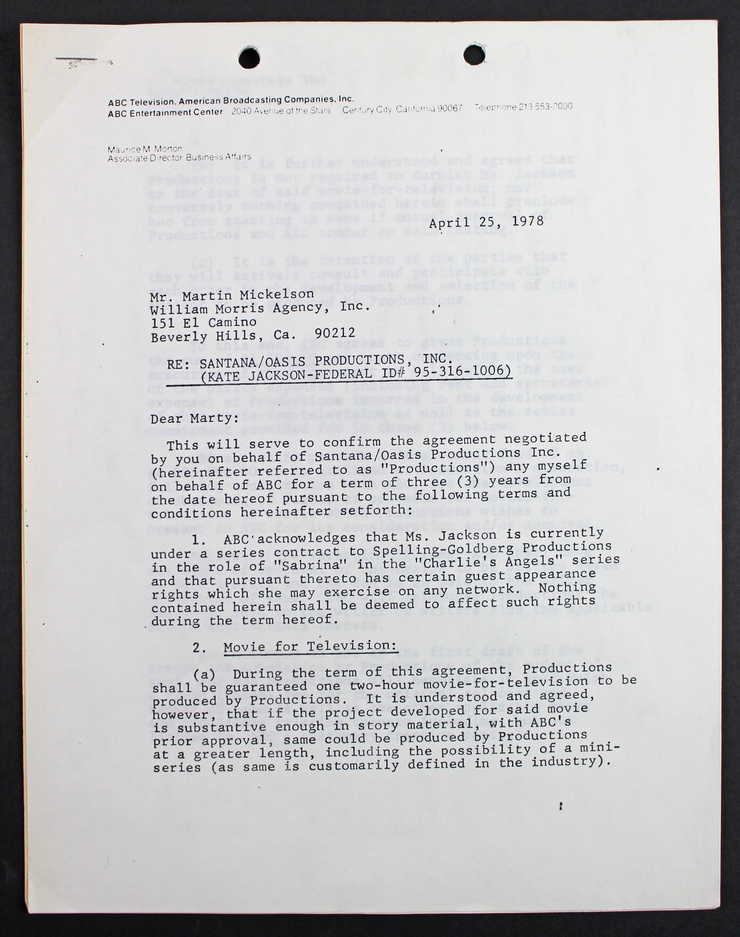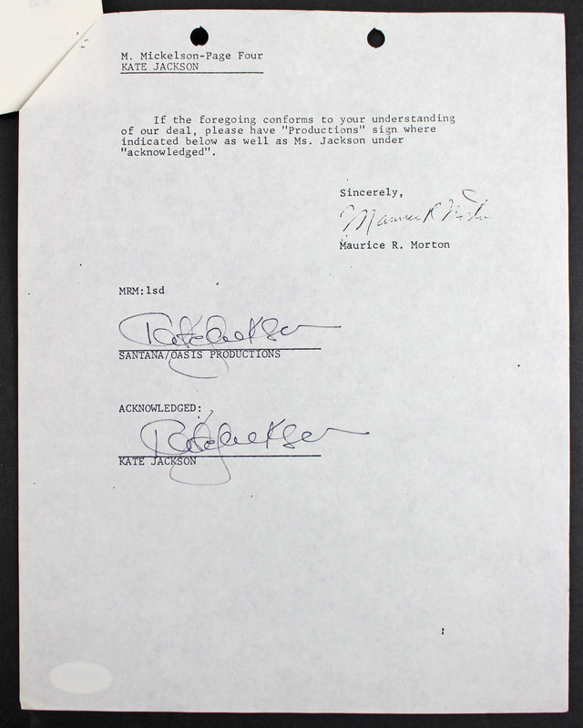 This rare and historic double-signed contract, dated April 28, 1978, has been personally autographed by Kate Jackson, the beloved star of Charlie's Angels. A true collector's piece, this four-page development agreement between ABC and Kate Jackson outlines plans for a made-for-TV movie, miniseries, or show, to be produced after her commitments to Charlie's Angels concluded.