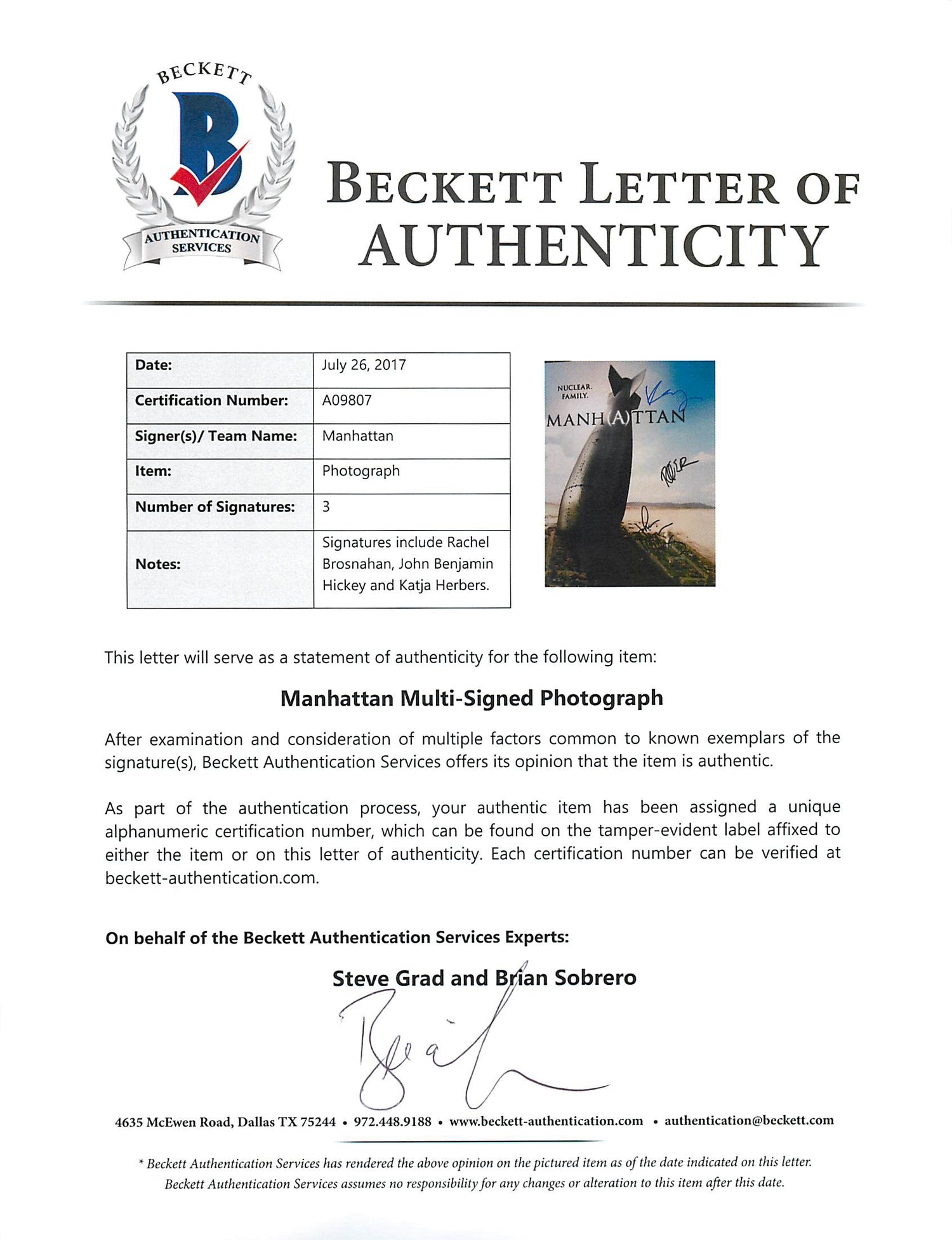 Manhattan (Rachel Brosnahan,Katja Herbers +1) Signed 11X14 Photo BAS #A09807