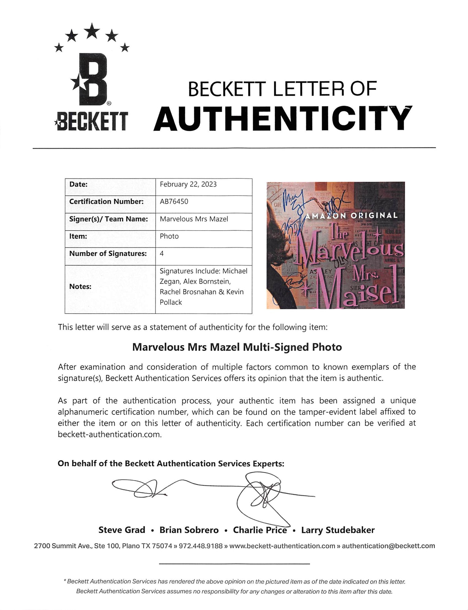 - Hand-signed by the cast – Featuring Michael Zegen, Alex Borstein, Rachel Brosnahan, and Kevin Pollak