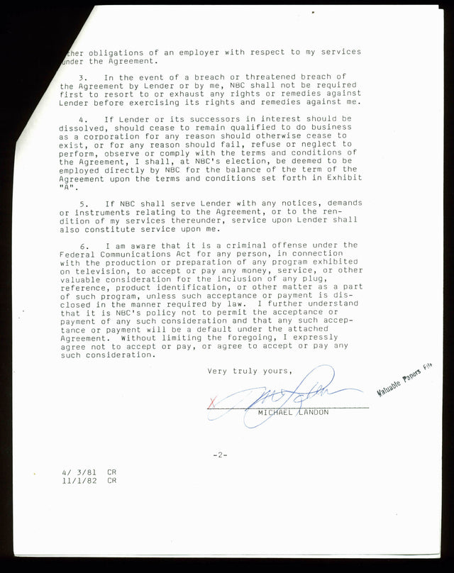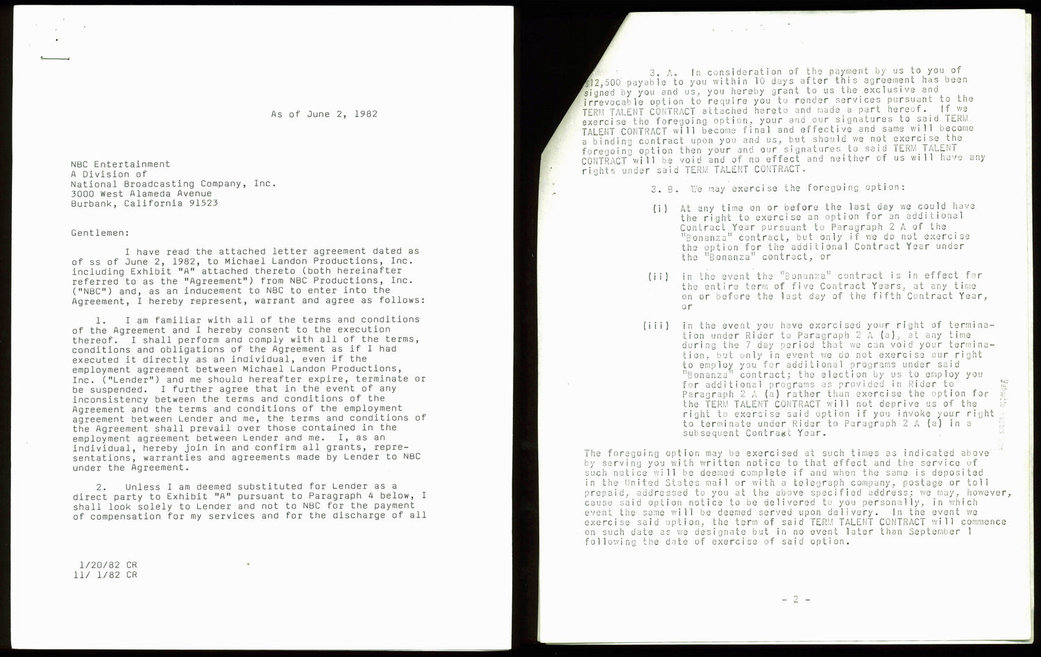 - Historic 1982 NBC Contract – A unique piece from the era of Landon's television dominance.