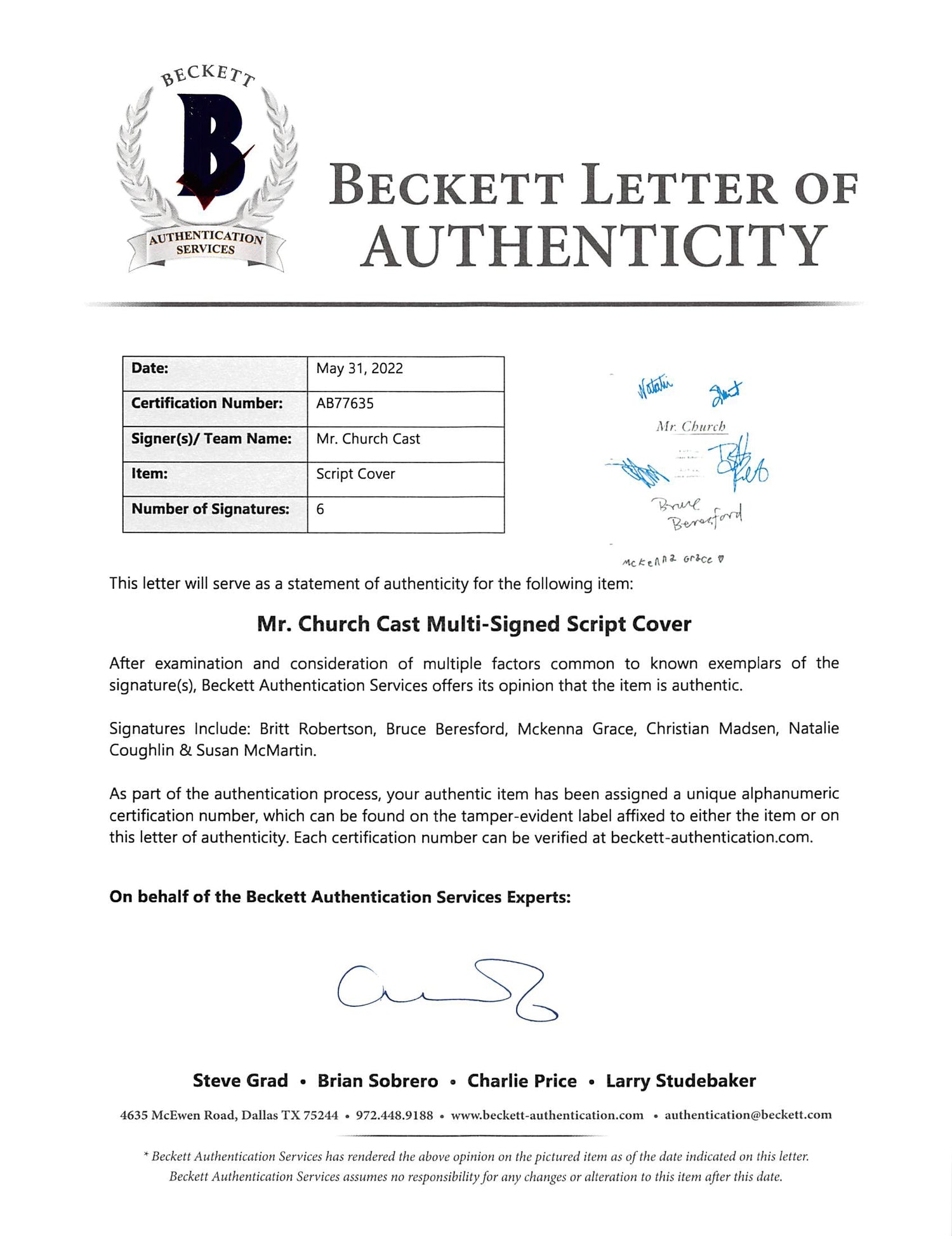 Mr. Church (6) Robertson, Beresford +4 Signed 8.5x11 Script Cover BAS #AB77635