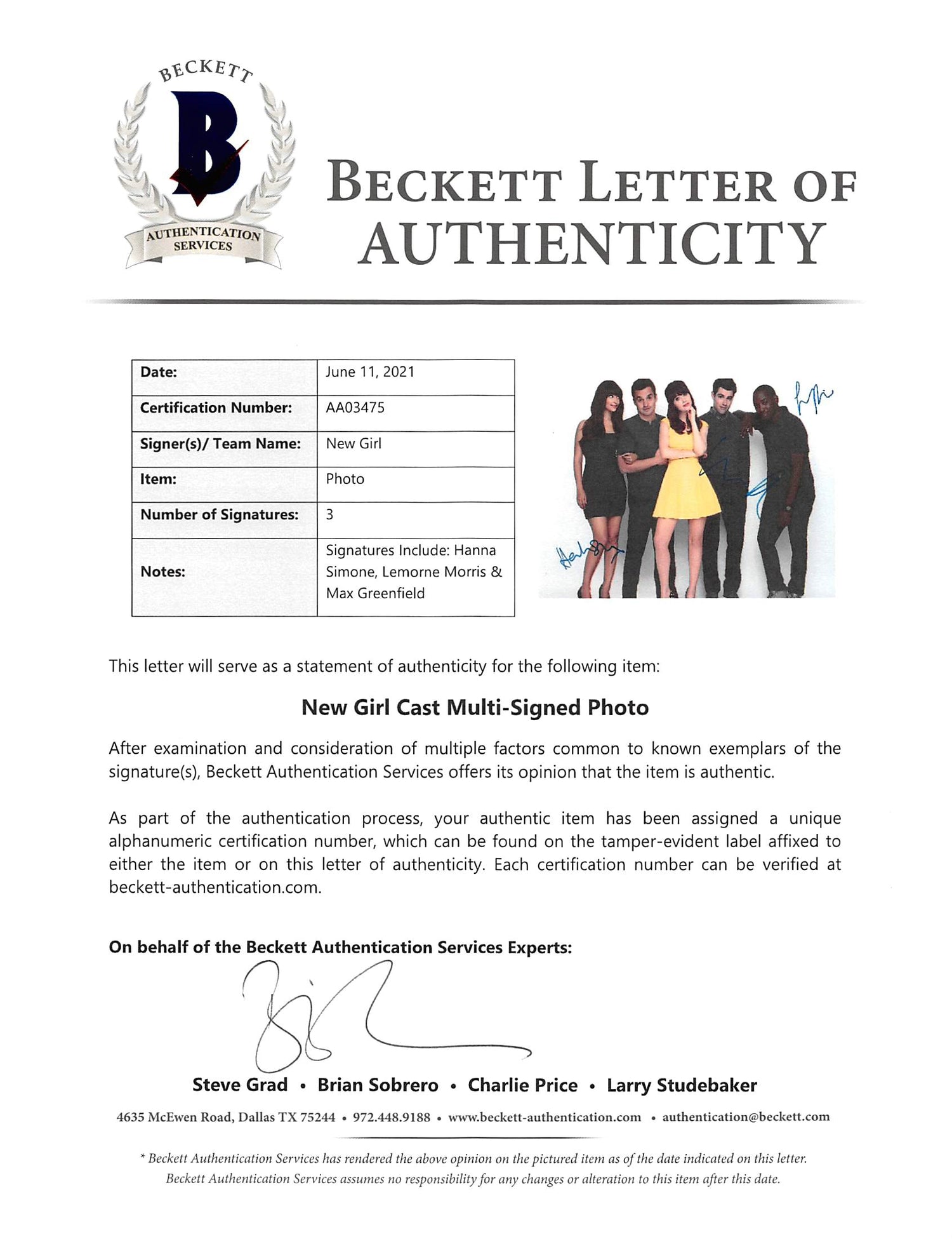 New Girl (3) Simone, Morris & Greenfield Signed 11x14 Photo BAS #AA03475 is backordered and will ship as soon as it is back in stock.