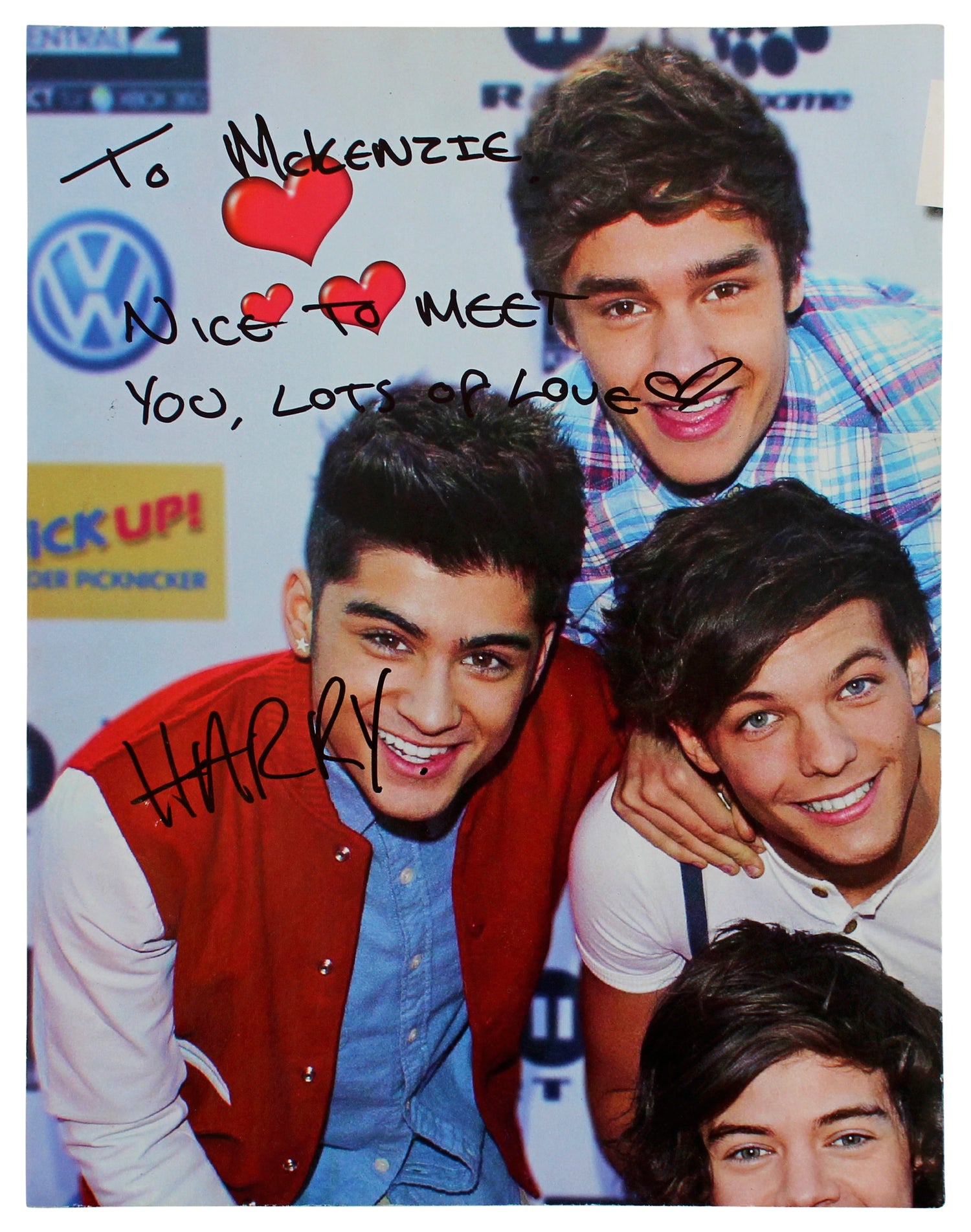 This Autographed Folded 16x20.5 Tiger Beat Poster is a rare collector’s item personally signed by Niall Horan & Harry Styles of One Direction. Featuring the handwritten inscription "To McKenzie Nice To Meet You. Lots Of Love," this unique piece brings fans closer to two of the biggest names in pop music history. Authenticated by Beckett Authentication Services, this signature is 100% genuine and a must-have for true collectors.